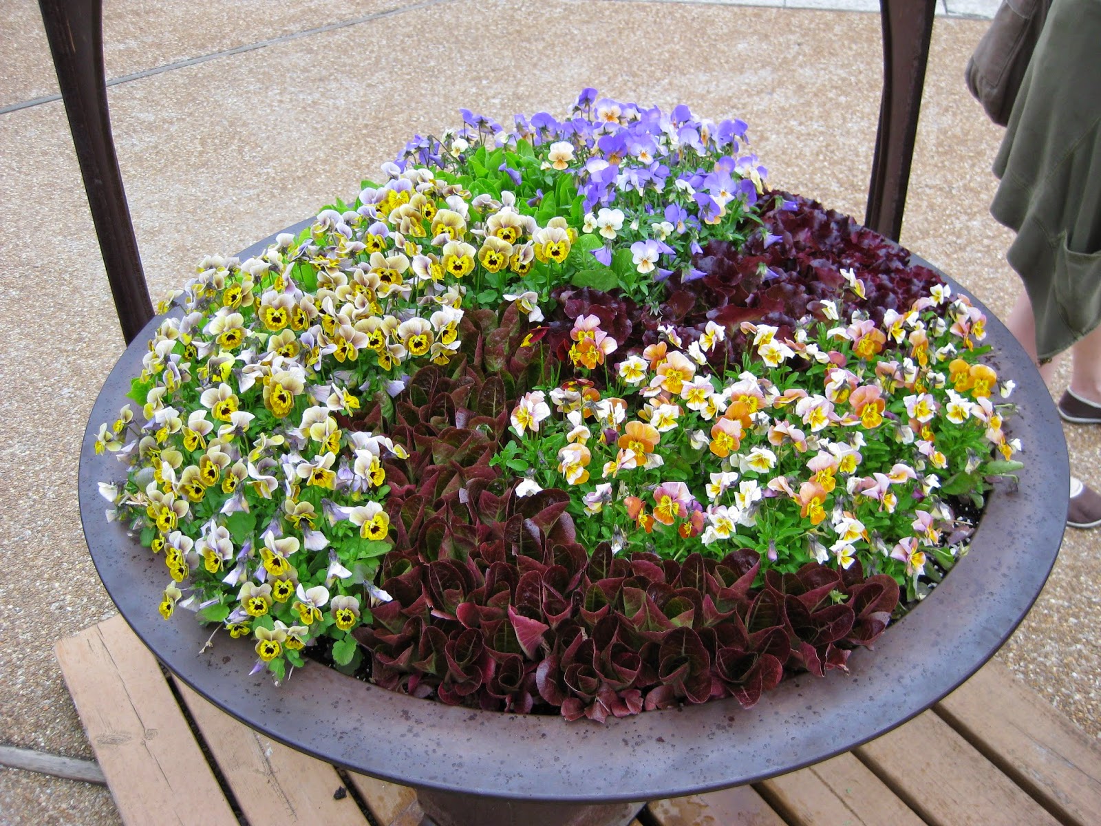As it gets warmer and you look at your empty containers, consider an early spring approach as there are many cold tolerant vegetables and annuals that can be planted that wont mind the 60 degree days and 40 degree nights we may have in April and early May. You can easily have a spring container adding interest until the summer transition in early June. Above and below are my uses of some deck planters at home for greens. Easily sown, quick to germinate, cold tolerant and delicious, this is a nice early use of container space. All of these containers below were photographed at Olbrich Botanical Gardens (Madison, WI) in May (various years) and they also were later transitioned to summer displays for more heat tolerant selections. Olbrich does an excellent job in all their containers for not only combinations but seasonal emphasis. Don't forget that the fall season is yet another opportunity for a transition of color and interest that can extend well beyond frost. Know your plant before planting and follow guidelines for appropriate soil preparations, drainage, siting, etc. for your containers too!