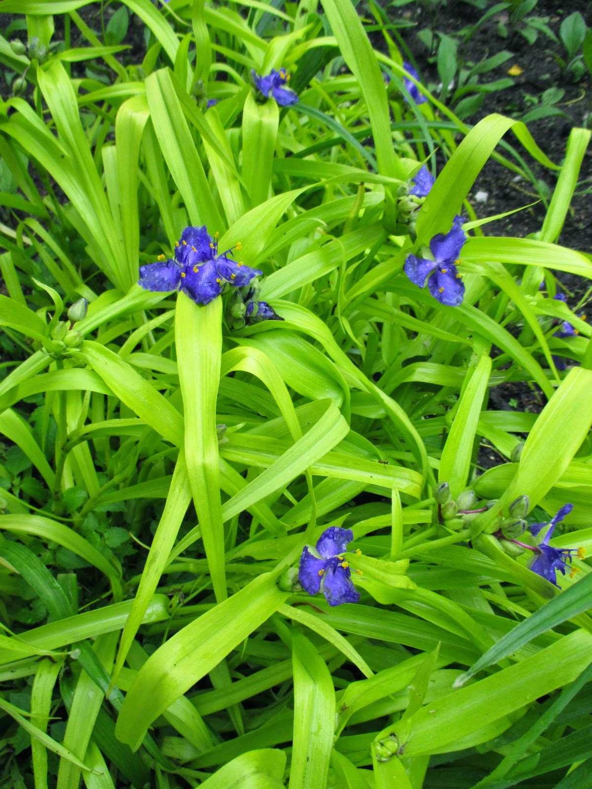 This blog is dedicated to the golden spiderwort (Tradescantia x andersoniana). This variety is called 'Blue & Gold' or 'Sweet Kate' and offers showy, chartreuse gold foliage and gentian-blue, triangular blossoms in late spring well in to early summer. I enjoy watching the entire show from foliage emergence (see below) in late April all the way to flowering and a mature height around 15" tall. Preferring moist, well-drained soils in full sun or part shade, this variety packs a visual punch and looks very much like a grass with narrow foliage. While the foliage tends to be more gold (as opposed to chartreuse) in full sun, you might see some leaf scorching in hot and dry locations. Consider afternoon shading or dappled light for longer foliage appeal. If the plant gets bedraggled for any reason, cut it back severely for fresh growth to emerge and quickly fill in the space. I like this perennial a lot although you may see green seedlings in close proximity to the parent plant (see photo directly below with one green seedling). Be vigilant about pulling those out to maintain the integrity of this golden perennial.