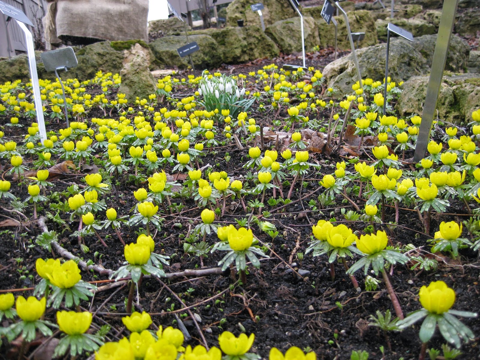 This blog is a tribute to the winter aconite (Eranthis hyemalis) which is blooming under the snow right now out in the gardens! This is a fall planted bulb and is one of our first to bloom along with snowdrops (Galanthus sp.). Actual timing will vary as we've seen them as early as February and as late as early April depending on how spring arrives. In many cases, they will bloom up through the snow (see below). They are blooming well for us right now and have reseeded and colonized nicely. See further below for a photo of the seed head and some photos of some of our expanding colonies. New seedlings will take 3-5 years to bloom but also go dormant and disappear with older specimens by late May. Native to Southern France through Bulgaria, these buttercup relatives are in the Ranunculaceae family. "Hyemalis" means "winter flowering" and is an apt description of the the bloom time. We have winter aconites in many of our shade gardens as their bloom time corresponds to receiving plenty of sunlight before the overhead canopy of deciduous trees fills in and creates more shade. The bulbs are inexpensive and many recommend that they are soaked prior to planting (they look like giant dried raisins when you buy them). They are a true harbinger of spring and indispensable in the early spring garden where they'll provide decades of enjoyment as they continue to spread and add such cheery color!
