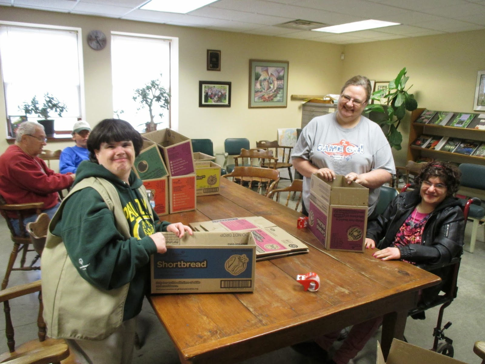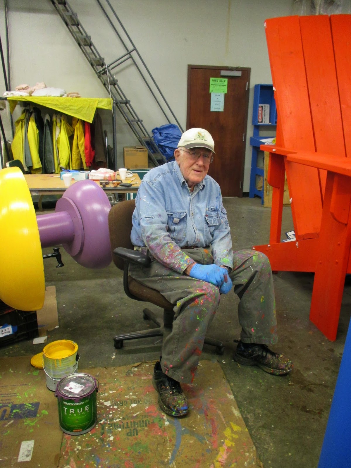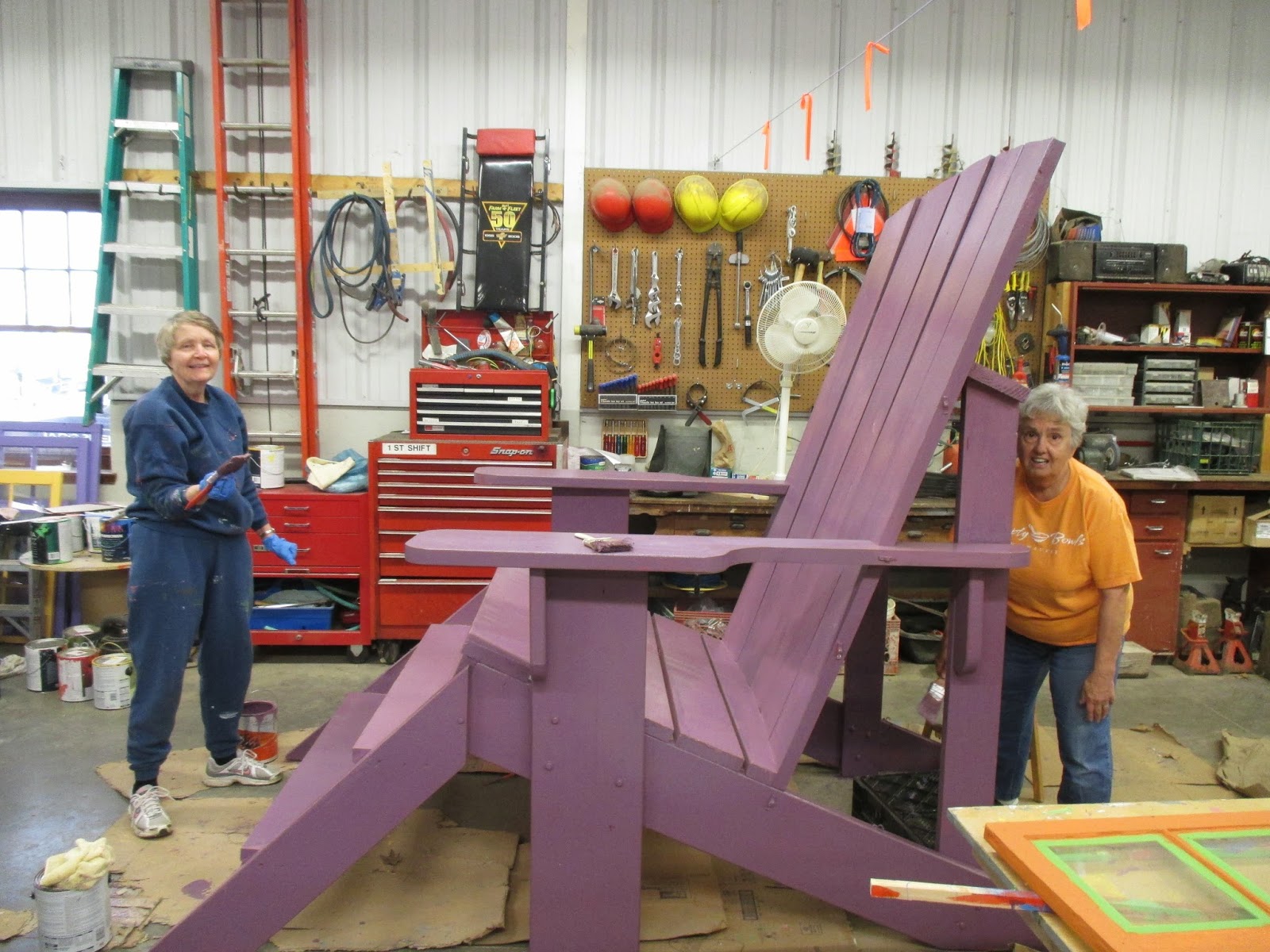 Above are Gena (left) and Myrt putting another coat of purple on this giant Adirondack chair (one of two) that made its original debut at the 2014 Holiday Lights Show. Nancy (below) helped as well and is seen here cleaning up the other chair prior to painting. Dr. Gredler (second photo down) was there to assist. Jenny came in to work on labels and Vern and Bob K. worked on some carpentry projects. Maury ran errands for us and Bob and Bev D. popped in as well. The third photo down shows the Chestnut House team (Janelle, Dawn and Victoria, from left to right) getting boxes prepared for the looming Spring Plant Sale on Mother's Day weekend (see our website!). Jordan joined the group and Janice helped out as well. We also saw Rollie, Urban, Jumbo Jim, Marv and many others today.