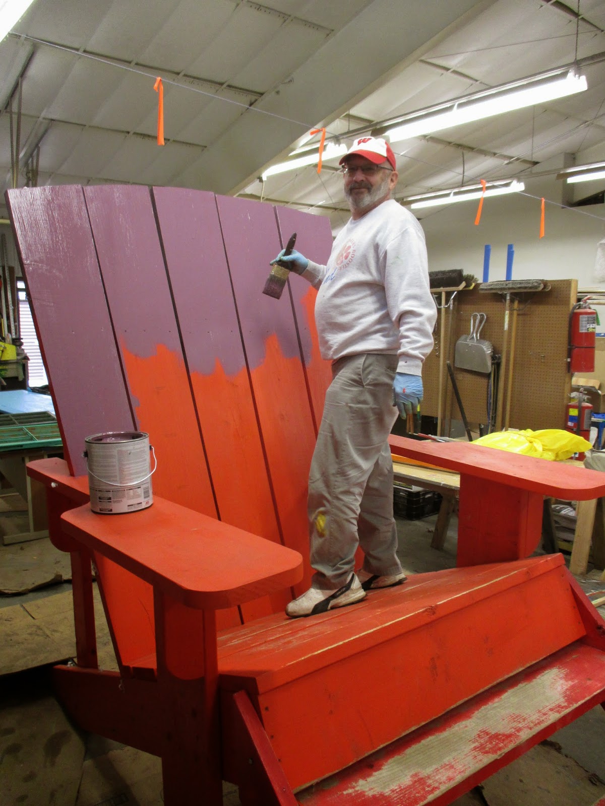 The images of volunteers in today's blog are actually from yesterday, like Alan M. seen above painting the giant Adirondack chair! The other photos below are referenced as well. Today we had Kathy come in for some solid weeding near the North point garden where she eradicated the first wave of thistles coming up in many locations. Peg was in to troubleshoot our registers for the looming Spring Plant Sale and Dr. Gredler was out spreading grass seed for a bit. Bob C. did some mulching and Vern was in for carpentry projects. Our Horticultural Therapy Committee met later and included Janice, Elaine, Darcie, Karen, Ellie, Lois and Art. Bill O. was in for some painting duties as well.