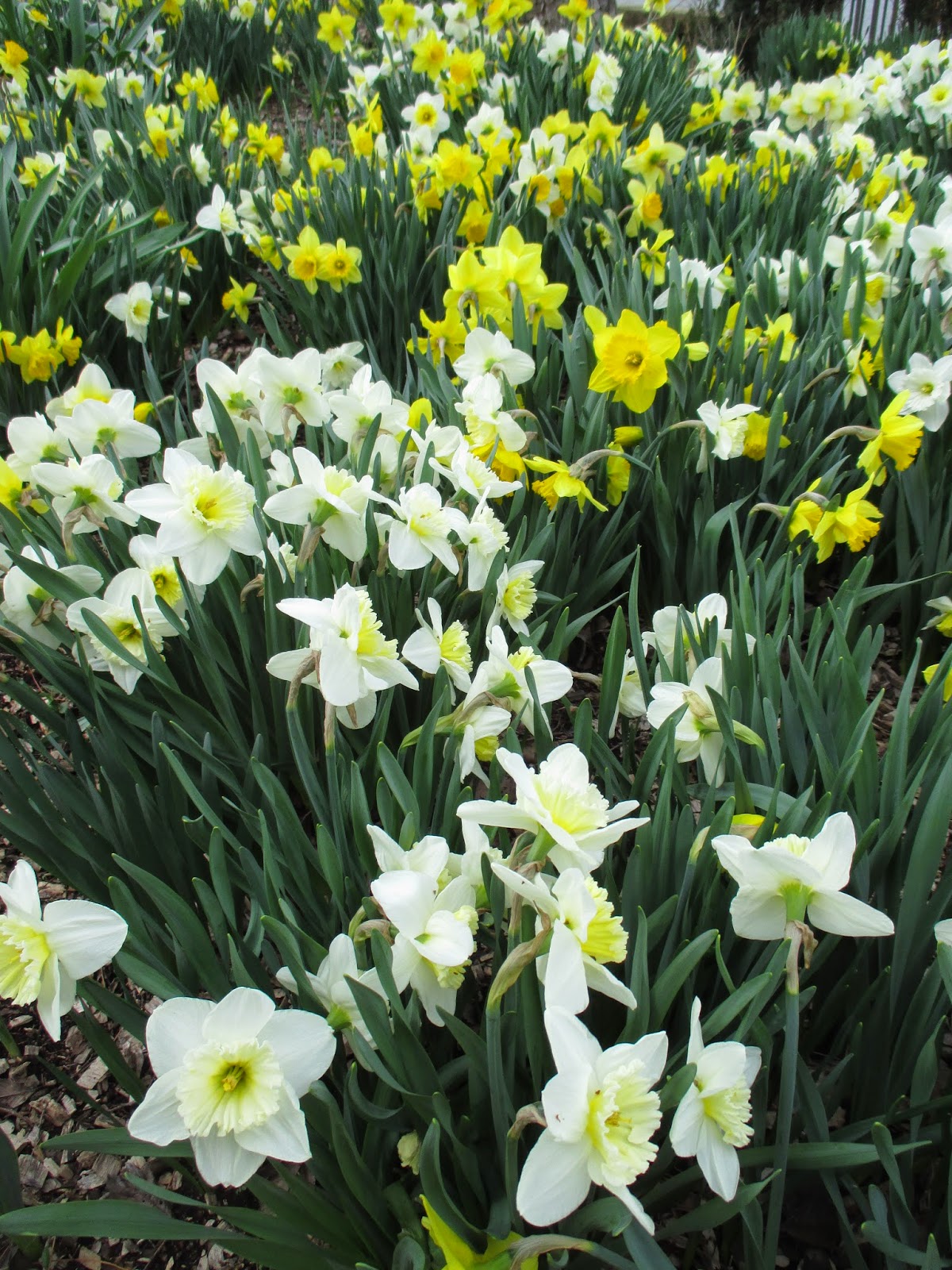 The wind was again howling today with temperatures barely reaching 50 degrees F. It was a lot colder on the west side of the gardens near the pond! While this isn't unusual for April, we're all hoping for a prompt return to warmer spring temperatures soon. There was still plenty of color in the gardens today like the marsh marigolds (Caltha palustris) seen above and the photos further below were taken today. While I only ventured briefly out in to the gardens, the grounds staff all had outdoor duties as well as some indoor tasks. Cheryl and Cindy potted up many of our cannas and elephant ears (Colocasia esculenta) that were stored over the winter months. They did a nice job potting up a couple hundred items including some delivered plants. The ladies then moved to outdoor gardening tasks with Cheryl doing tidying and planting and Cindy working on tidying and mulching. Janice worked on special events like the plant sale, pansy sale and headed out in the gardens for tidying and the cutting display. John and Terry continued work on preparing an area for the relocation of the wishing well (originally in the center of the Nancy Yahr Memorial Children's Garden). The guys also helped prepare other elements for installation out in the gardens like obelisks and our giant rulers for the Alphabet Jungle Garden. Larry finished his preparations on the sunken garden pool which is up and running. I had myriad meetings and completed some desk work as well.