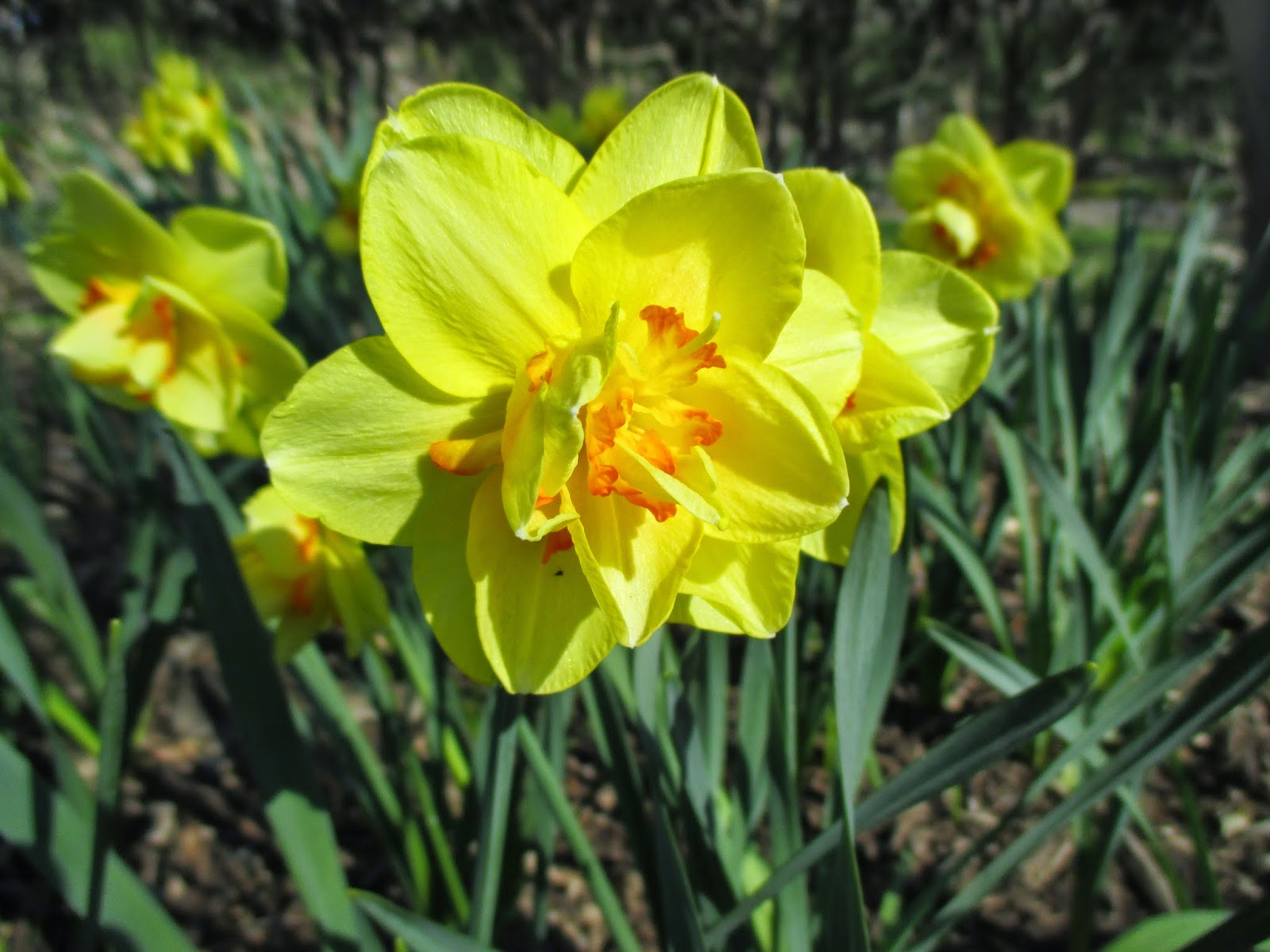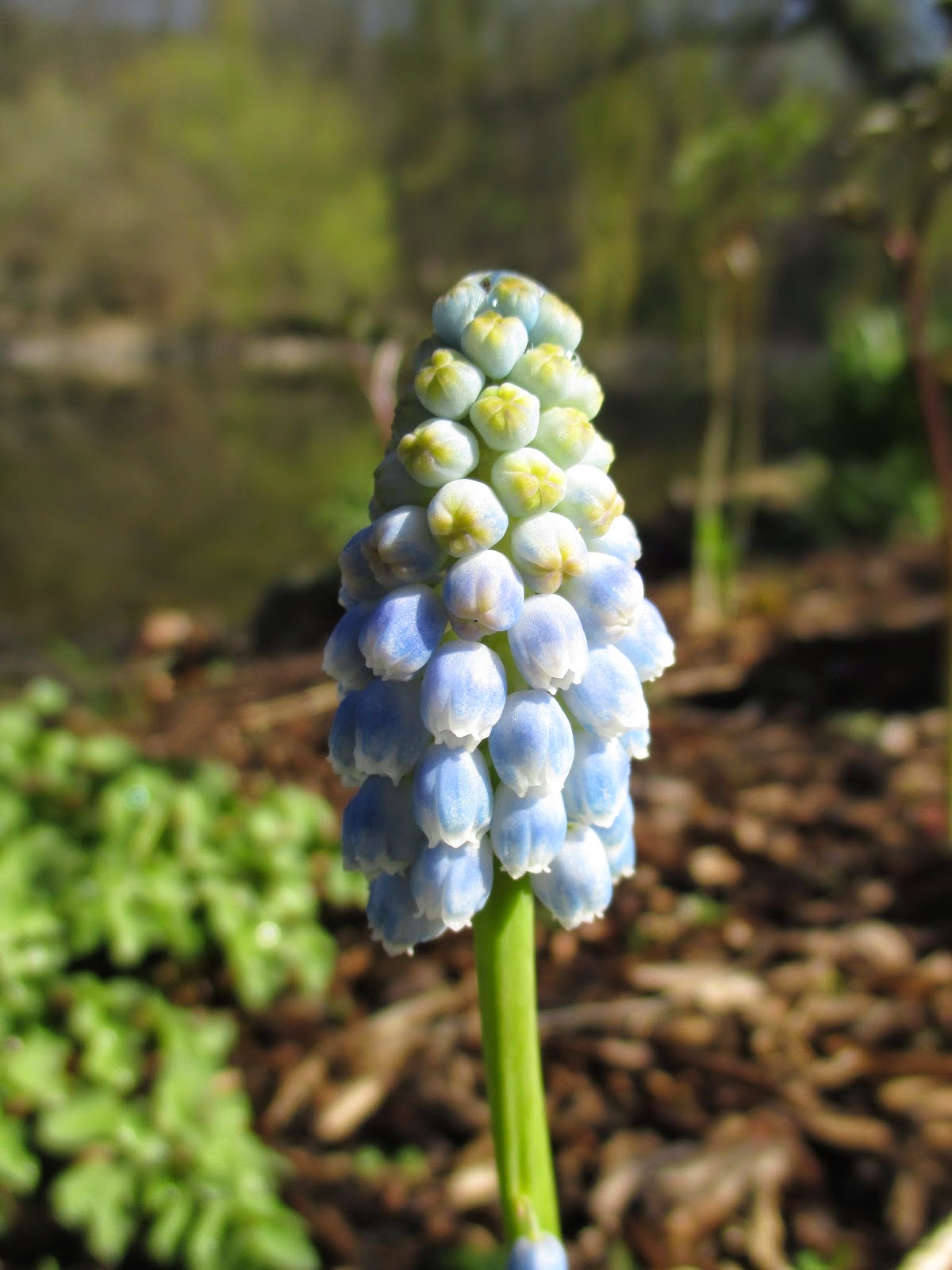 It was a lovely day at the gardens with ample sunshine and temperatures near 63 degrees F. There was plenty of color out in the gardens and it wasn't hard to capture beauty like that of this grape hyacinth (Muscari armeniacum) seen directly above. We had a great weekend with a successful Compost/Pansy Sale and the Golden Kiwanis Tree Sale occurring on Saturday. We will continue to sell pansies and compost up to (and beyond) our looming Mother's Day weekend Spring Plant Sale. The Earth Day activities at the Parker Education Center were also a success and we had a strong turnout for our volunteer training (Garden Ambassadors, Tour Guides and our Sunday Watering team). The grounds staff had a busy day today and we had lots of volunteer assistance throughout the day with a strong Grumpy turnout this morning. Further below are some additional photos from this morning.