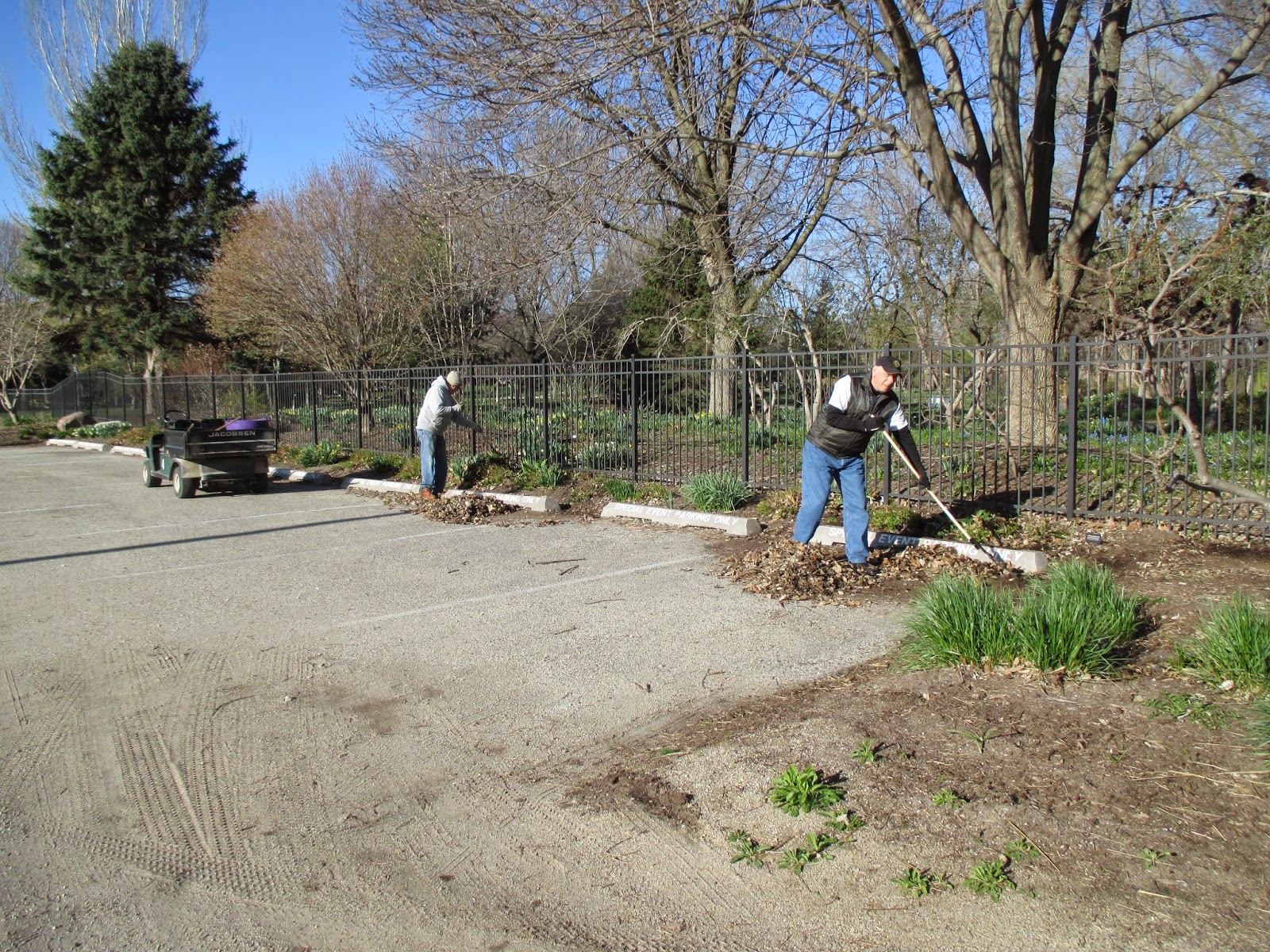 The Grumpies sprung right in to action today. Above are Alan (left) and Ron P. headed out to work in the arboretum where they were weeding the mulched tree circles first, then applying a fresh layer of mulch. The guys are doing a great job. Below are Ron R. (left) and Larry H. on one of their many trips to load up compost and spread it over the reception garden. The guys did a great job and composted almost the entire garden. The second photo down shows Bob C. (left) and Ron W. working on tidying up the East parking lot which really needed their attention. The guys hauled out many loads of debris and that parking lot looks the best it has in years! Vern, Dave, Ron Y and Bob K. worked on carpentry projects which includes making some new chairs along with many other smaller projects. Bobby K. was here all day and also helped with electrical work and other helpful tasks. Del was in for more painting and Kathy (third photo down) did a great job mulching. Hard to believe that she didn't quite get through those three massive piles seen in the photo. Jenny worked on more signage and headed out to tidy up the fern & moss garden. Pat M. continued work on one of the giant obelisks that we'll help get in place later in the week. Gary worked on signage and Rollie ran to the Milwaukee-area to pick up some of our new memorial bricks. Maury worked on odd jobs and ran errands for us while Dick H. hauled debris to the dump, went on a gas run and worked on some vehicles. Dr. Gredler was out mowing and aerating (fourth photo down) and this is the perfect time of year for this activity. Karen M. was back in action in the Japanese garden as well. We also saw Bev F., Gail, Linda B. and many others.