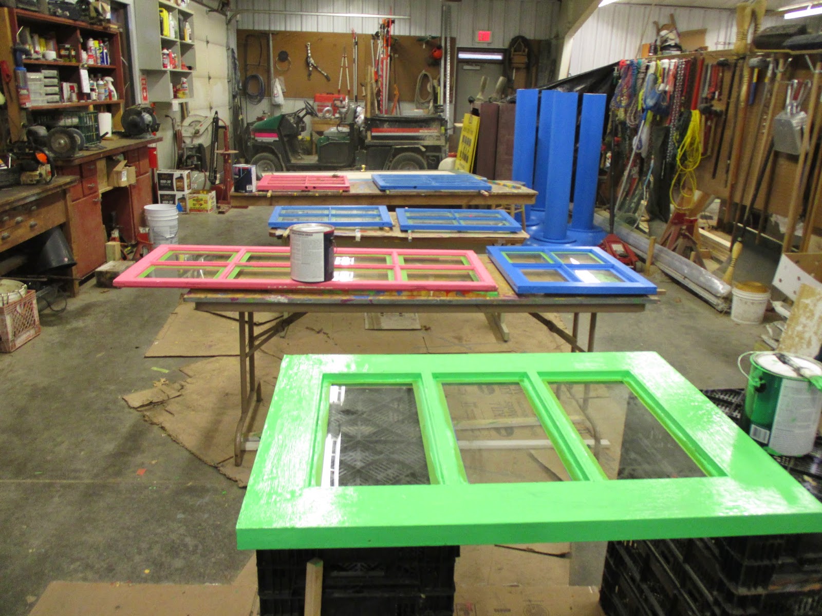 Today was overcast with intermittent drizzle, particularly in the afternoon. I thought we would have a total rain out today but did have some dry periods that allowed for work out in the gardens. We also had a full crew at the Horticulture Center. Above is Terry (yesterday) moving our second giant Adirondack chair back from the gardens. Our two chairs were a hit at the Holiday Lights Show and will be repainted and brought back out as part of our Alphabet Jungle Garden theme (more on that in a blog next week). The windows and doors seen below will also go back in to that lush and colorful garden. Larry, Big John and Janice all had a wide range of tasks today including plenty of indoor work as the weather dictated. John went on a major shopping spree for garden equipment, fertilizer and supplies while Janice did a huge amount of work for the looming Spring Plant Sale on Mother's Day weekend.