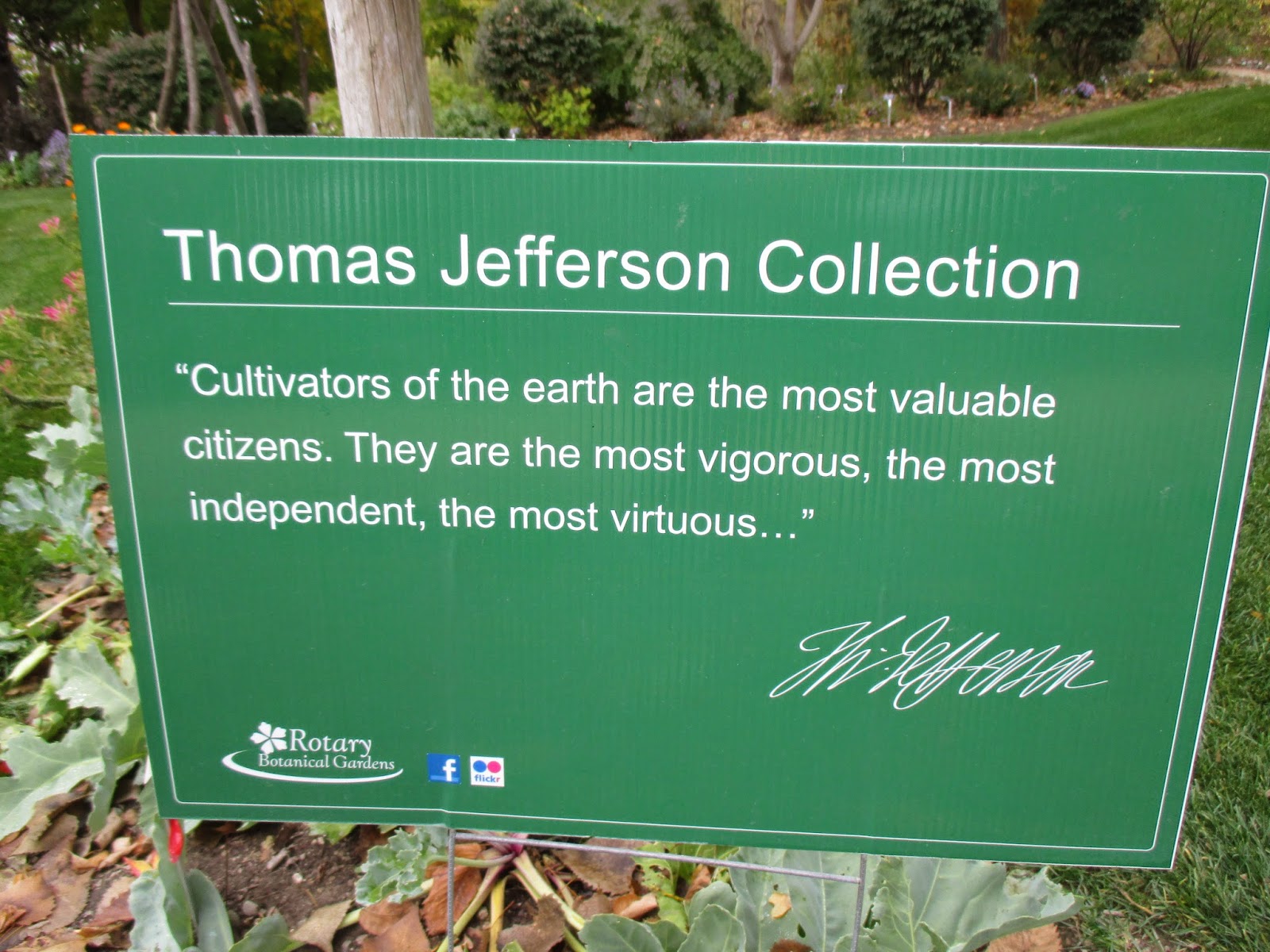 Bob C., Ron R. and Alan M. didn't let the threat of rain stop them from getting some garden work done including composting and raking. John and Larry were also out in the gardens for a bit and Urban came in for some afternoon pruning. Gary B., Pat S. (new Grumpette) and Dr. Gredler had plenty of painting duties and were joined by Gene. Ron Y., Dave, Jim, Vern and Bob K. continued with carpentry projects which includes the construction of more obelisks for the Spring Plant Sale and sales out of the Cottage Garden Gallery. Vern and Bob K. were around in the afternoon as well. Dick H. ran five loads to the dump and helped Maury haul supplies to storage. Maury had other errands and Bill O. came in this afternoon to help out. Gary S. worked on more labeling and Jenny E. stopped by to pick up more lists that she'll translate and convert to new labels for incoming seasonal plants. We also saw Rollie, Dr. Yahr, Ken C. and many others today. The second image down shows our "indoor jungle" of elephant ears (Colocasia and Alocasia) and bananas (Ensete ventricosum 'Maurelii') that we've had inside since early October. They are getting by but will thrive once we can get them outside and planted! The remaining photos feature the very popular Thomas Jefferson Collection that was such a hit last year. This is the second and last year of that collection out in the gardens.