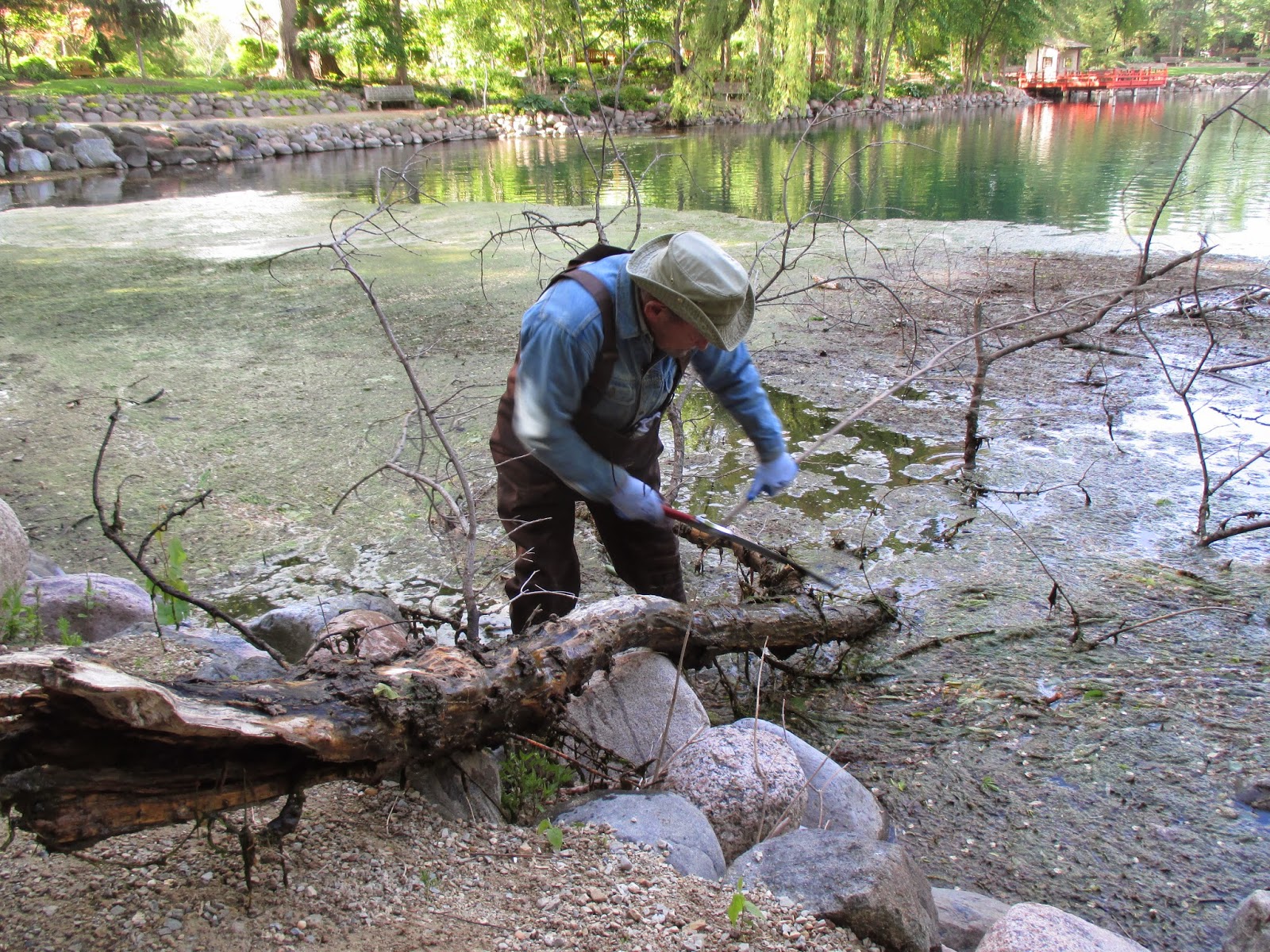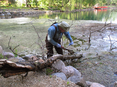 Larry pulled the short straw and had to get in to this smelly muck to retrieve this branch which was creating a "sludge dam" near the gazebo