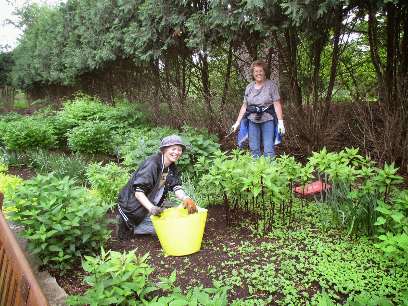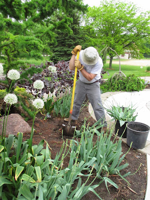 Our volunteers came in and did a great job before the rain caught up to us around 11 am. Above are Eva (left) and Kathy continuing to do battle with the weeds in the sunken garden. The ladies have advanced over 75% of this space and are headed towards victory soon. We'll plant up these openings soon and hope the next wave of weeds isn't as tough to remove. Kay was also in for weeding and did a nice job out front in the entrance garden before getting saturated. We had Alan, Larry H., Lloyd and Pat M. out front this morning "lifting" our spring tulips (Tulipa). We do this every year as we put in a new color each fall. The boys almost finished before it became too muddy. Dr. Gredler and Bill O. did some mowing while Del continued his painting project. Dick H. had some repairs while Bob K., Dave, Jim and Vern continued on a multitude of carpentry projects. Gary S. came in for label work while we also saw Rollie, Dr. Yahr, Art H. and many others.