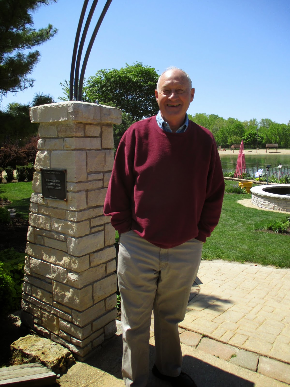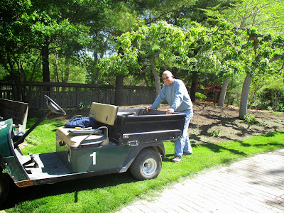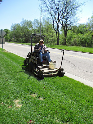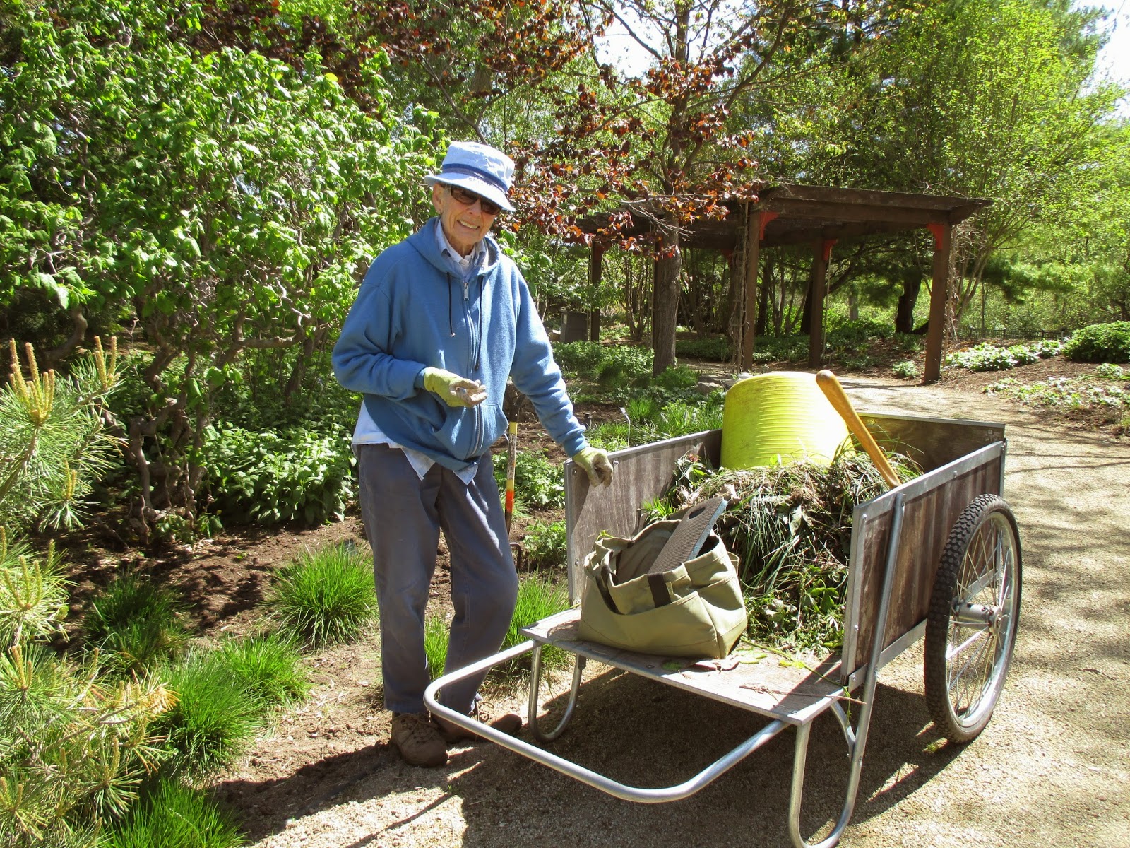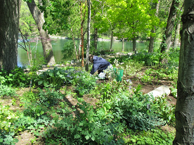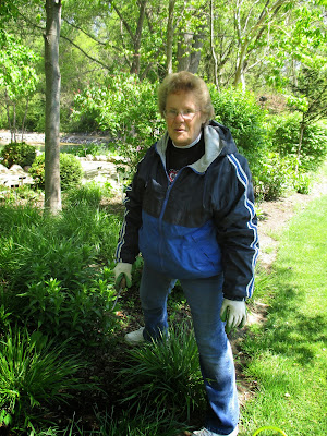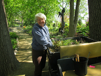 Good volunteers were in abundance today. Aside from our plant sale volunteers mentioned above, we had quite a few gardeners out there as well. Marv (above) spent significant time on his moss area and continues to do battle with some invasive weeds. Dick P. (below) continued to install memorial bricks in various locations. Jan R. (second photo down) did a nice job clearing out a solid cartload of weeds from the Scottish garden which has been her "assigned garden" for many years. She always does a great job. Dr. Gredler (third photo down) did some painting and mowing. Eva (fourth photo down, hiding), Kathy (fifth photo down) and Kay (sixth photo down with her eyes closed..) all converged on the woodland walk garden for continued weeding. The timing is perfect as we hope to mulch that garden very soon. The ladies did a great job. Maury (seventh photo down) was in to work on various projects and ran errands. We also saw Dick H. (working on a truck), Vern (carpentry), Alice C. and many others today. Further below are some additional plant photos from today.