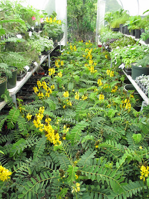 our popcorn cassias (Cassia didymobotrya) are poised and waiting for installation