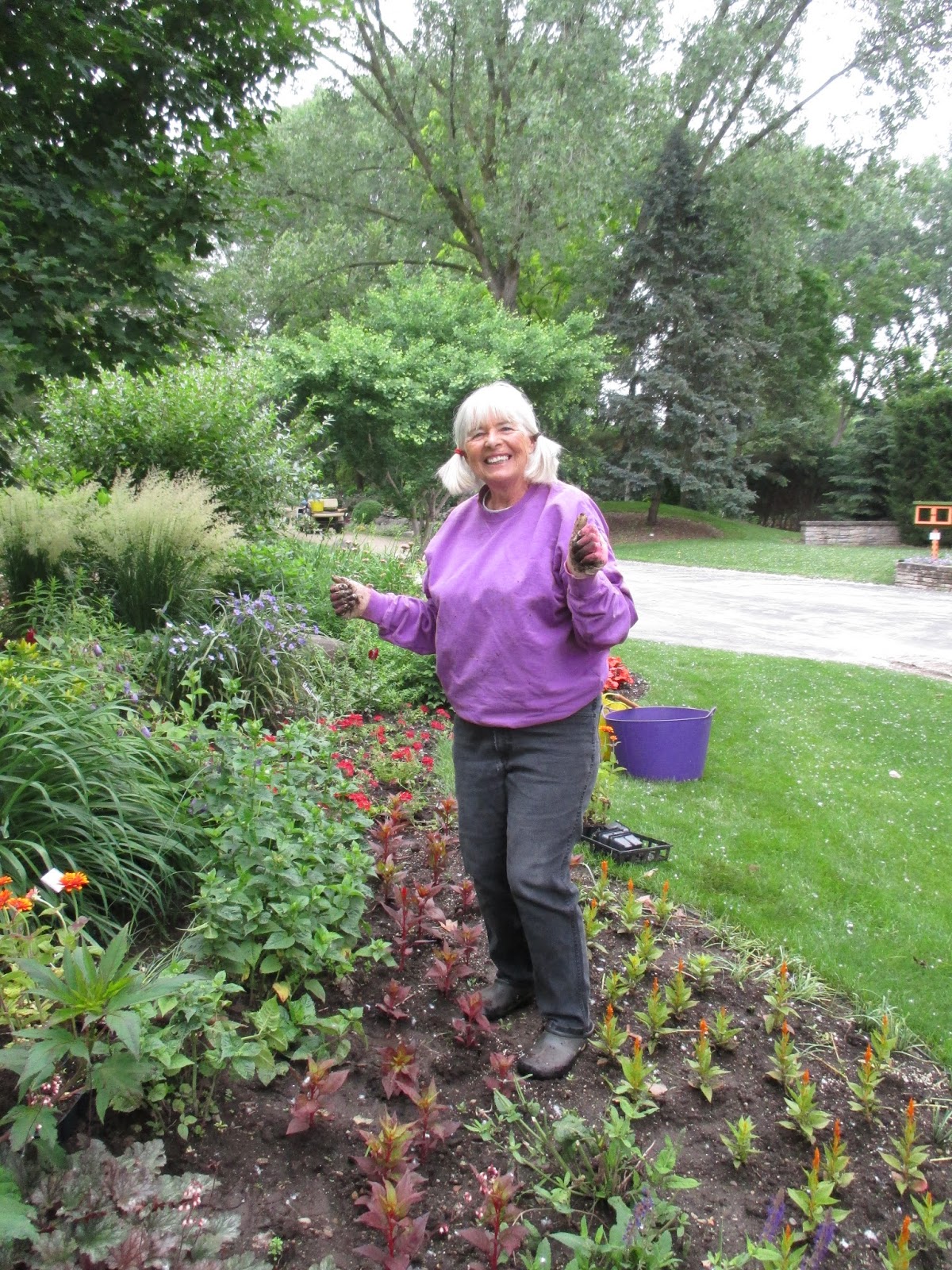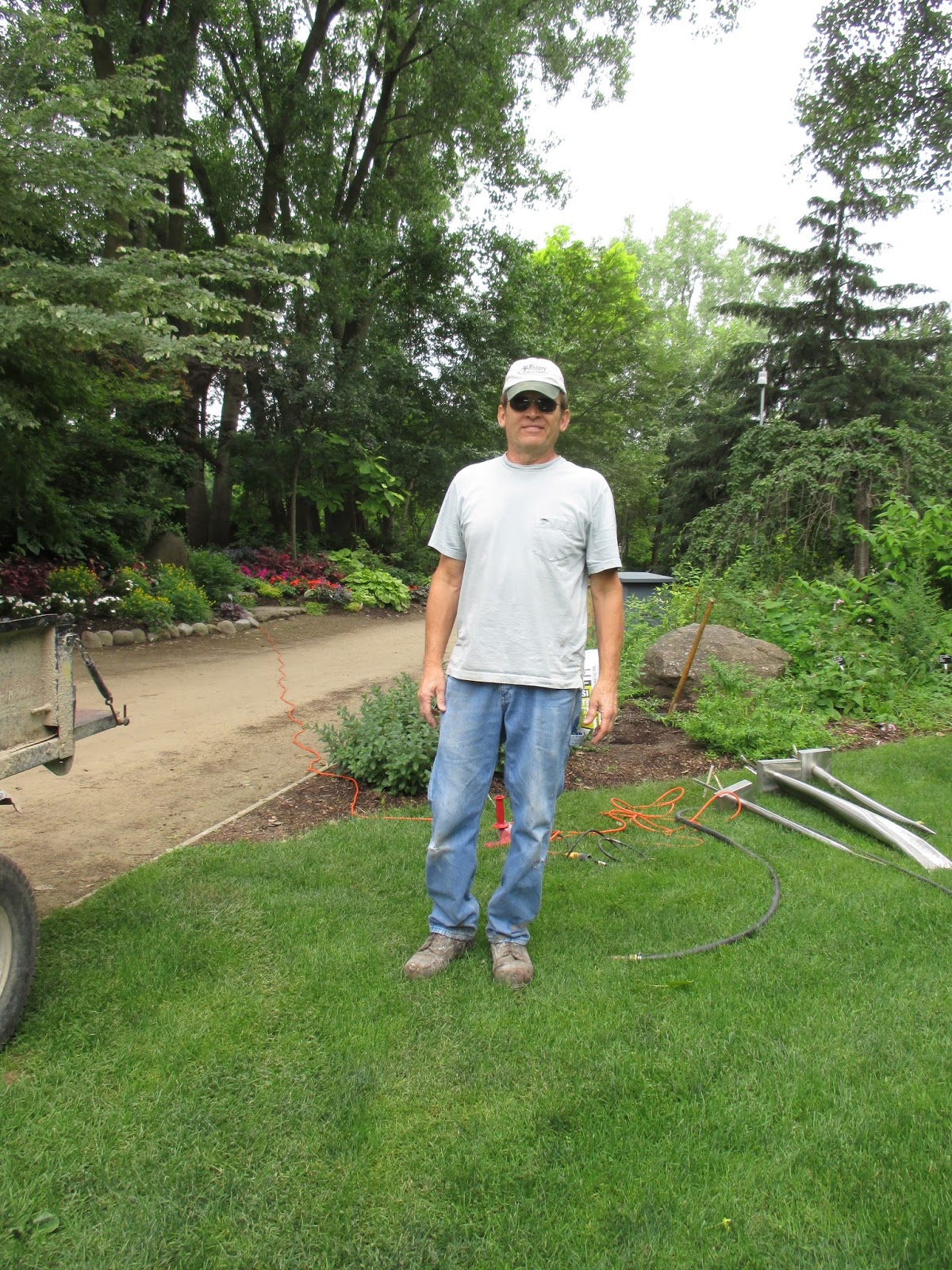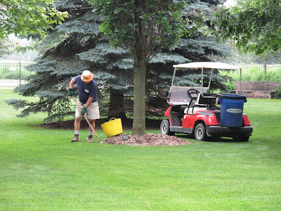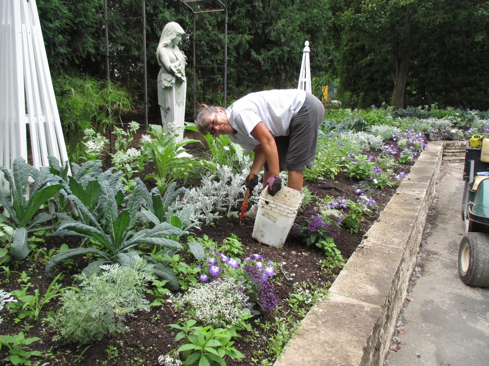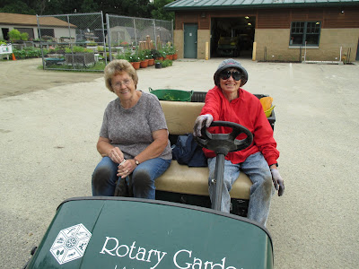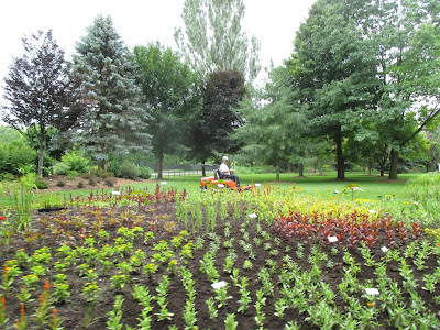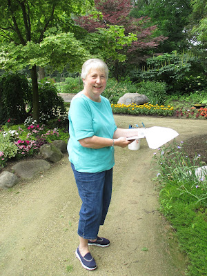 Our volunteer crew did a great job out in the gardens. Barb (above) planted another 50 or so large tropicals in the Alphabet Jungle Garden and was joined later by Vicky for some serious weeding in that same space. Directly below are Resa (left) and Cookie as they headed out to the North point garden which they tend so well. The ladies tidied up and helped with some work in the Smelly Garden and surrounding areas as well. The second photo shows Pat C. in action. After some clerical work, Pat and I went out and inventoried labeling needs in the gazebo garden and a portion of the woodland walk garden. We're looking at label replacements, repairs and plants that need labels too. This is an ongoing process although we hope to get caught up this year! Jenny was in to tidy up the hosta hollow garden (her assigned space) and later joined Kay (third photo down) with some weeding near the gazebo garden after Kay finished her two planting projects (one of which can be seen in the photo). Bobby K. (fifth photo down) installed more sculptures and spent a good portion of the day helping organize the carpentry section of the Horticulture Center. Pat M. came in for some projects and Bill O. did his mowing rounds. Kathy and Eva (sixth photo down, Eva in red) continued their weed battle in the entrance garden and continue to make great headway. We also saw Mary H. and Kathy P. tidying their area and Maury was around for multiple errands. I feel like I'm forgetting some volunteers but we sure had a great crew today!