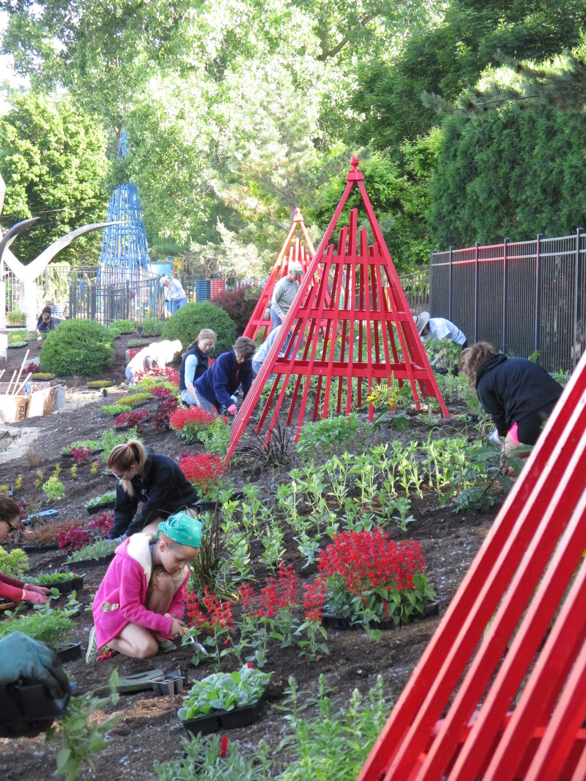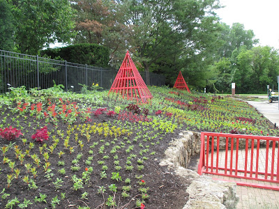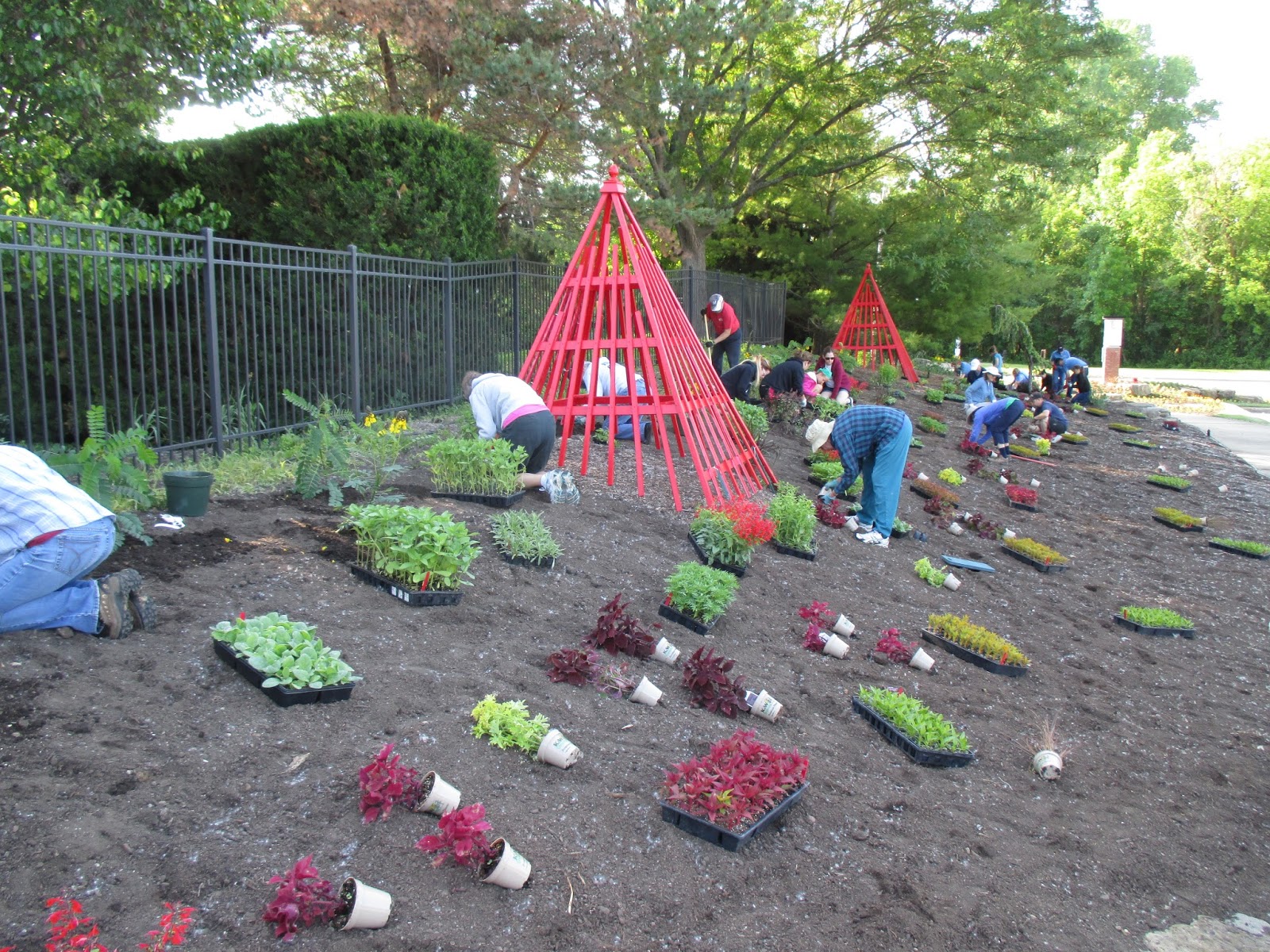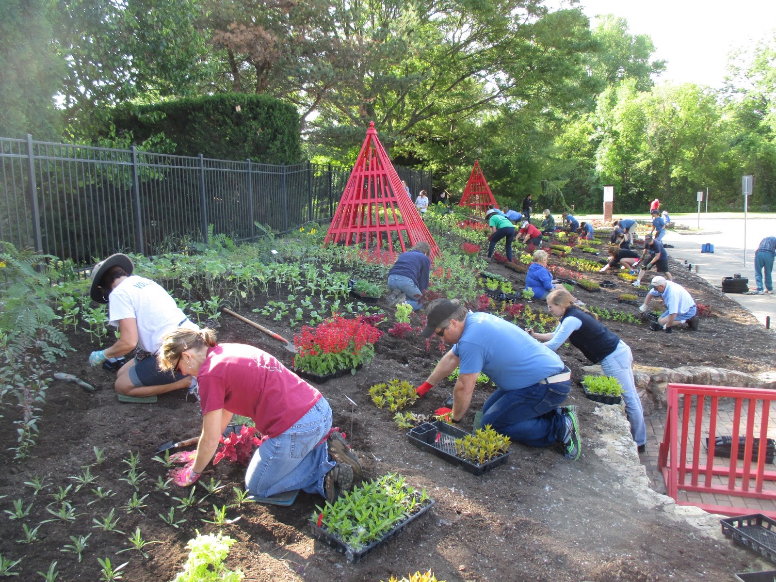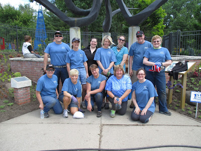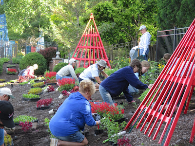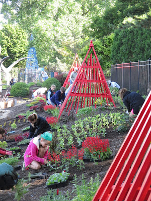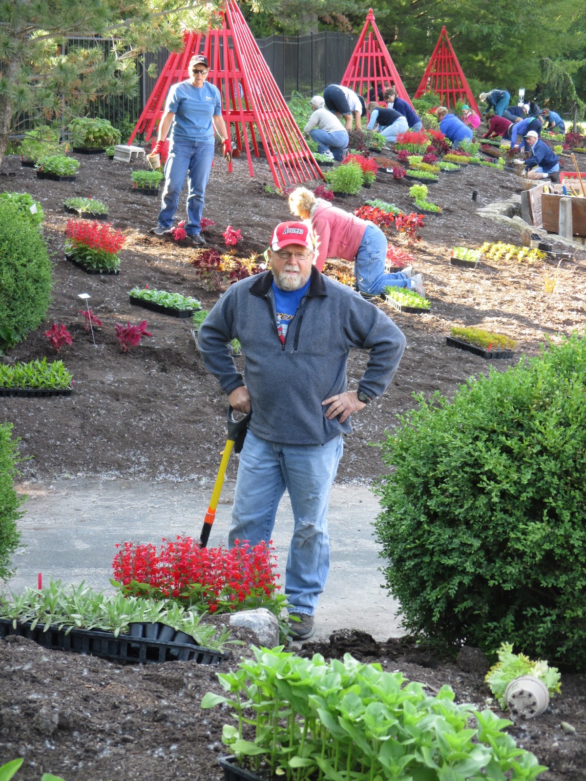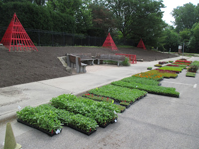 In a nutshell, we had 43 volunteers install 12,000 annuals in about 3.5 hours which is truly amazing. We had wonderful, hard-working volunteers like Lily seen above and a strong contingent of Mercy Health System employees came to volunteer is well (see their photo further below). Special thanks to Larry, Bill, Big John, Janice and Gary for helping orchestrate all the moving pieces of this project which started yesterday with what you see below and ended up looking like that last two photos below. Thanks again to all the wonderful volunteers that helped plant the entrance garden and we look forward to another strong turnout for the Volunteer Work Day next Saturday, June 13th. This would be our fifth of five successful work days and we'll plant some other large areas. Rose and Urban were also helping out with painting on the observation pier which is a monumental task.