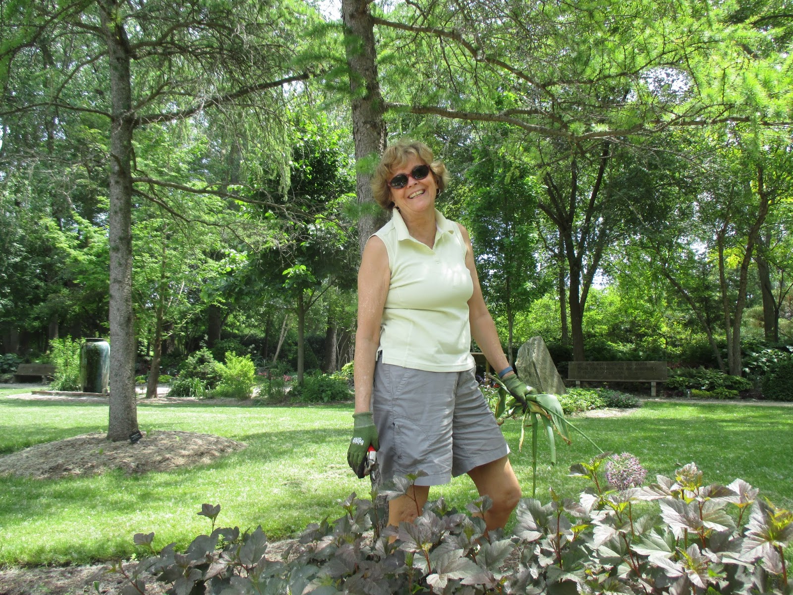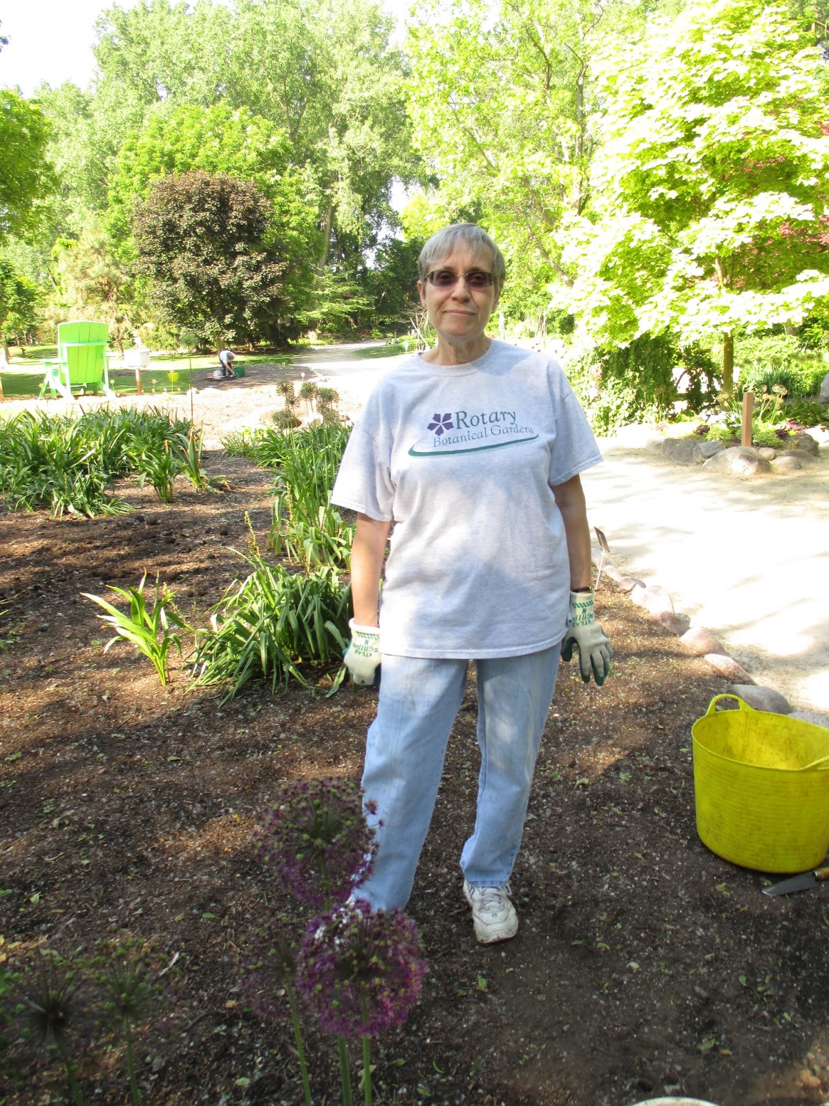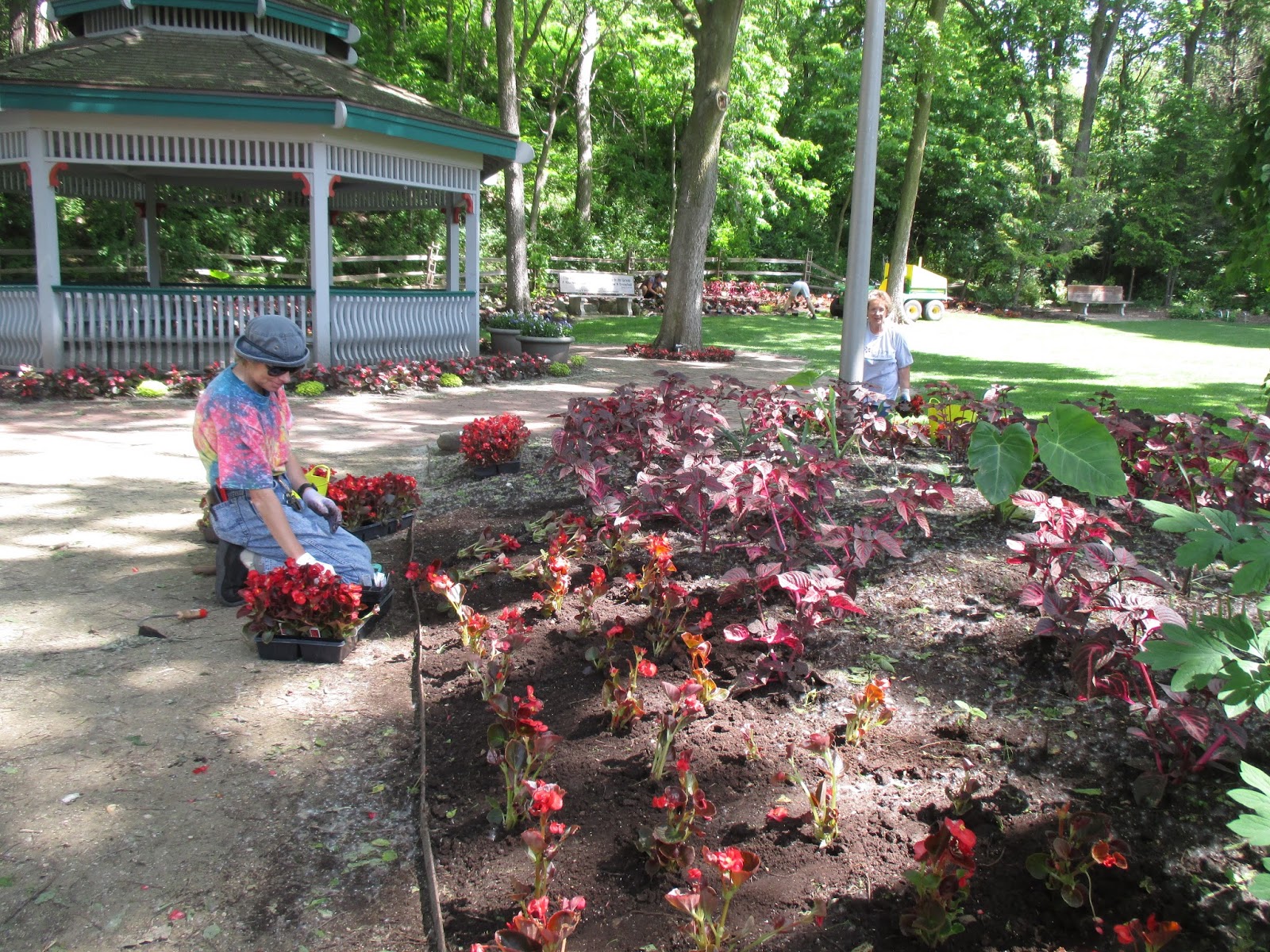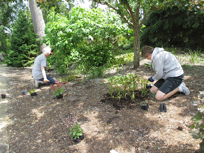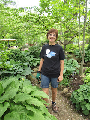 I wasn't able to photograph all of our volunteers but we sure had an excellent turnout. The Story & Stroll program had a huge turnout and it was nice to see all those folks out in the gardens along with the students who arrived for the Youth Education Program. Our education volunteers were in action all day. .Betty (above) and Shirley (directly below) both worked in their assigned garden areas on weeding which will be followed by significant planting next week. Jan R. weeded in the Scottish garden and Kay continued her onslaught of purslane in the entrance garden. The second photo down shows Eva (left) and Kathy (hiding behind the pole) doing some planting in the gazebo garden after they finished weeding the entrance garden slope just before Big John and Terry came through with the rototillers. The third photo down shows Mary D. (foreground) and Vicky planting the gazebo border (seen in the top photo). The ladies put in a good 500 plants and Vicky stuck around for watering and clearing out more bulb foliage in another garden that we have to plant next week. It's nice having her back in action. Jenny (fourth photo down) and Dave tidied in the Hosta Hollow garden and Jenny installed more hostas in that colorful space. They both put in some solid time and are excellent gardeners, volunteers and past RBG grounds employees! The fifth photo down shows Nancy (left) and Gena planting in the larch area this afternoon where they were joined by Mary (sixth photo down) and Patty (seventh photo down). They planted a good portion of our All-America Selections garden and Paula and Emily came later in the evening to continue on this same project. Janice worked with the Chestnut House volunteers and they did an excellent job selecting and installing plants for the raised planters at the Horticulture Center. Vern continued installing signs for the Garden Art Project ("Nature Nooks") and Mary Kay worked on the lending library. We also saw Chuck S., Dr. Yahr and many others today. I'd call that a solid turnout!