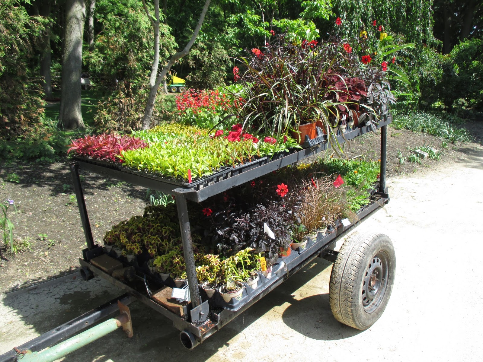 Above is just one of three large areas that I placed plants out for installation today. My cart (below) is very handy for this task as I can haul 36 flats at a time! The area above is in the gazebo garden which we're planting in advance of a large wedding this weekend. I also placed plants out in the larch area and the terrace garden. The excellent weather today, coupled with super volunteers, kept me moving to keep ahead of our planters. The weather still looks good for the week although a little rain in the coming days would be alright with me. We hope for a dry Saturday morning for the fourth of our five Volunteer Work Days (8 am until 12 noon, meet at the Parker Education Center). We plan on planting the remainder of the entrance garden Saturday which will receive another 6,000 plants or so this weekend to complete our yellow/orange/red theme. I couldn't be happier with the progress today by both staff and volunteers and I think the average bed time for all of us tonight will come sooner after accomplishing so much!