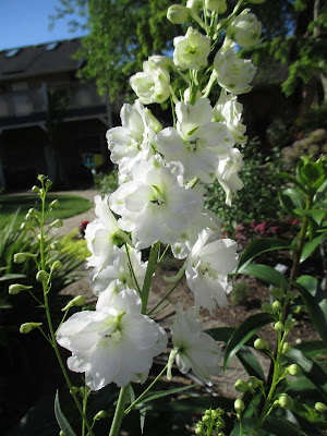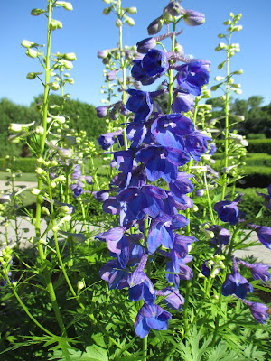 It was another beautiful day and while we enjoyed the sunshine and heat, the importance of watering became more evident today as it begins to dry up again. We ran some sprinklers throughout the day and did quite a bit of hand watering. Areas in the shade are still damp but keeping up with areas in full sun will become challenging unless we get the rain predicted on Saturday night. The gardens are showing more color each day. Above is one of our many varieties of breadseed poppies (Papaver somniferum) in the English cottage garden which is also peaking with a wide range of delphiniums (Delphinium sp.) seen directly below. That is certainly a colorful space although the gardens continue to get more exciting everywhere as all the seasonal color fills in over the coming weeks.