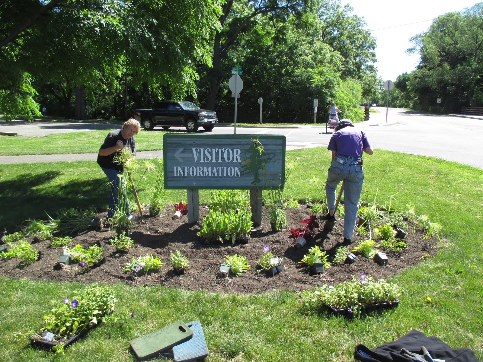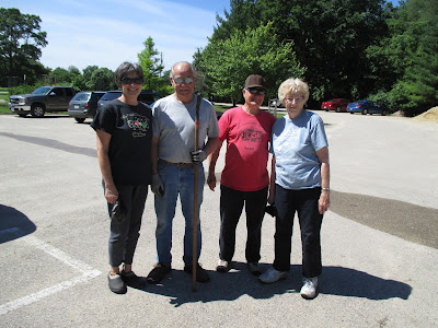 Above is Mark S. who is our RBG maintenance man. I rarely am able to photograph him but he insisted today. Mark is a huge help at the main building and does a great job with his many responsibilities. Our volunteer turnout was excellent today. Below are Kathy (left) and Eva planting the Janesville Area Convention and Visitors Bureau sign over in Palmer Park. We do this every year but the ladies started this after two hours of solid weeding with Shirley in the woodland glen garden. The second photo down shows the "fearsome foursome" of (left to right) Joan, Corky, Bob and Bev. These veteran volunteers did a great job tidying around the Horticulture Center beds. The fourth photo down shows Kay and Marty, both of whom planted. Kay also tidied up her area and helped weed in the sunken garden as well. Cora came in to plant containers and Paula and Emily were also in for planting. Big Jim and the RECAPPERS worked on a wide range of projects and Bill O. did his mowing rounds. Pat M. helped water the yard this morning. Chuck S. came in to give a cart tour and Maury stopped by as well. I think Jan R. was in to work in the Scottish garden and we saw quite a few Janesville Area Herb Society members as well out in the gardens. Below is some of the volunteer action in evidence today.