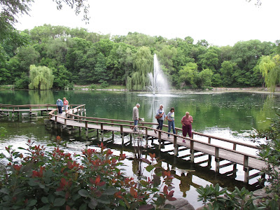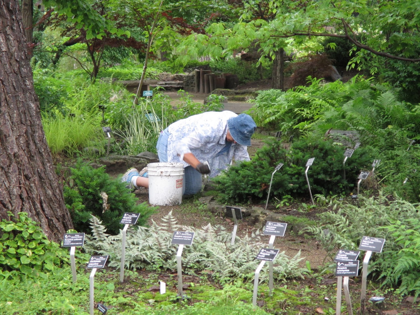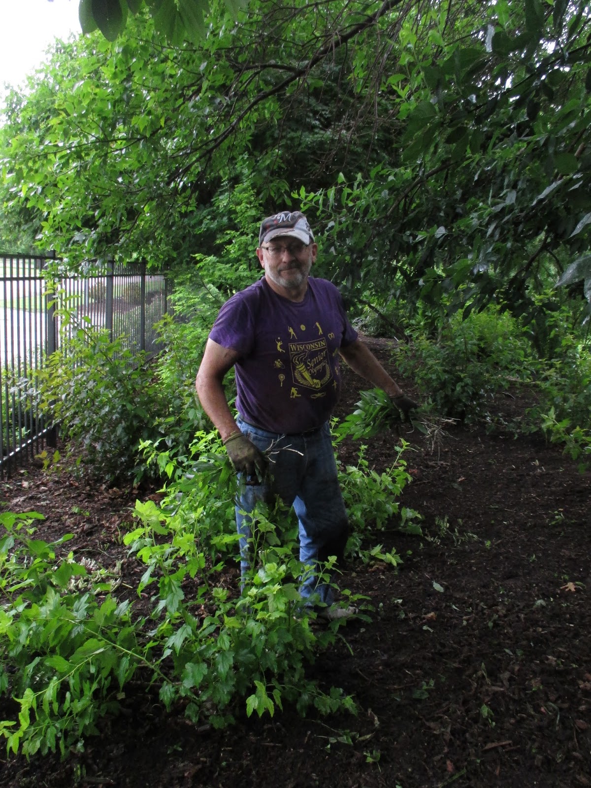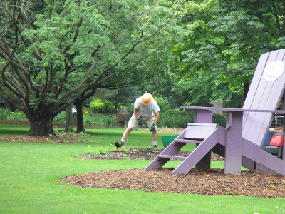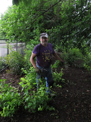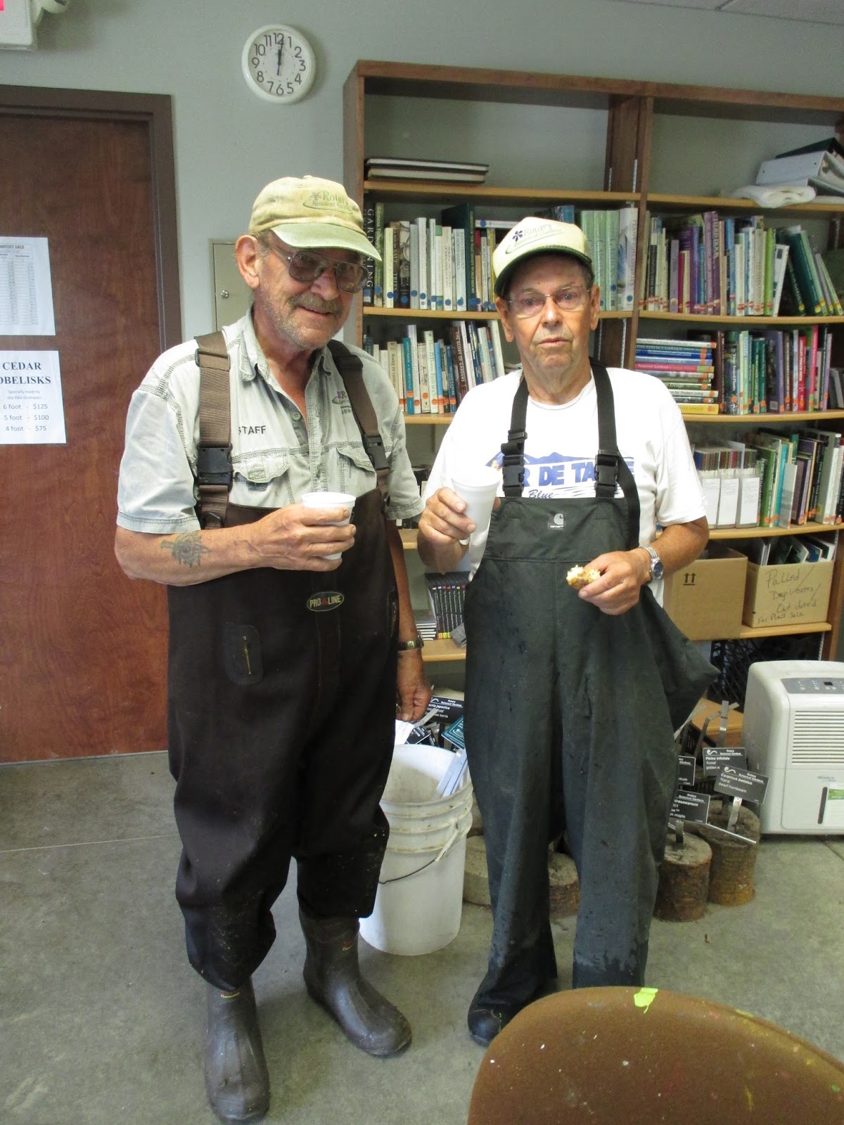 Above are Jim (driving), Dave (reclining) and Bobby K. coming back from scouting their carpentry repair job on the back porch. The guys have done a nice job upgrading some of our aging porch and it should be good for many years to come. Bob stayed all day and is working on multiple projects for us. Below are Ron R. and Alan (second photo) near the East parking lot where they finished the weeding of one of our largest shrub borders. The area is as tidy as it has ever been and will get mulched very soon. Sandi (third photo down) helped inside when it was rainy but later headed out with Janice for some weeding in the fern & moss garden. Peg and Winifred worked together on some yard projects and ended up weeding in the entrance garden the rest of the morning. They did a nice job tidying up the primary entrance garden right outside the Parker Education Center. Susie (fourth photo down) did some planting in the mud and did a nice job putting in another 200 plants or so near the gazebo garden. Kylie and Forrest did some weeding near the shade garden and Pat M. (fifth photo down) weeded in the arboretum. Gary made more labels and Maury ran for gas and did some other errands. Vern was in for some carpentry projects and Dr. Gredler did his mowing. The sixth photo down shows Larry (left) and Bill after they spent many hours in the pond getting debris away from our aerators and water movers. We also saw Rollie, Art, Bev and many others today.