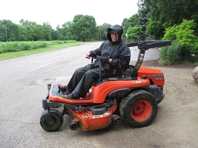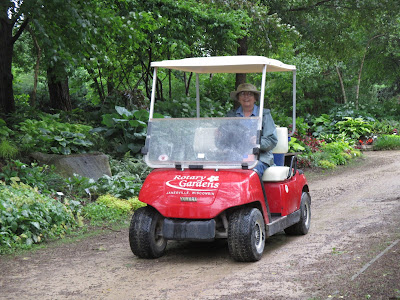 Raincoats were the order of business for all of us throughout the day. Above is Bill out mowing and Dr. Gredler joined him as Friday is our day for getting all the lawns ready for the weekend. Shirley (below) was a weeding ninja in front of the building and did an excellent job tidying up. Pat M. (second photo down) had finished his soon-to-be-patented "lights caddy" which will allow us to unspool lights as we go for the Holiday Lights Show (HLS). Hard to believe that we'll start testing lights in August with set-up for this fundraising event beginning again in late September. Vern and Ron Y. came in for some carpentry work and Chuck S. gave Ken C. some training for our cart tours. Gary came in to produce more labels and Bev D. was very helpful preparing labels and starting to match labels to the plants for our Elephant Ear Collection which will be planted next week. We also saw Bob K., Dave G. and many others today.