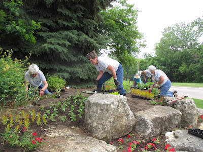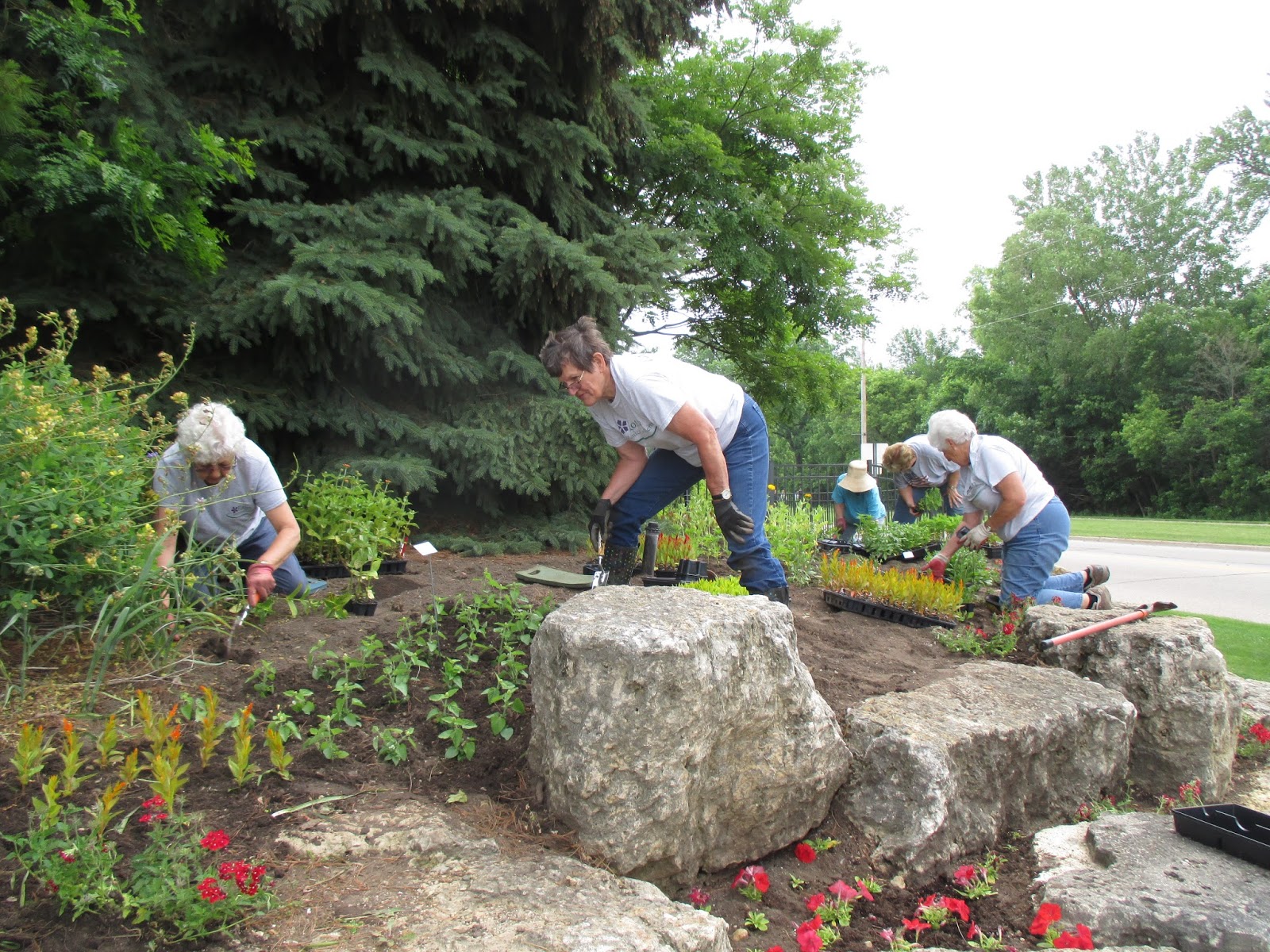 Marilyn, Suzie, Mary R., Peg and Bonnie all planting