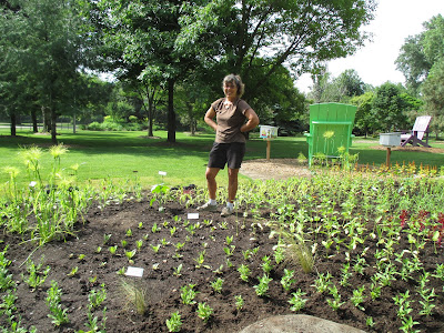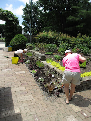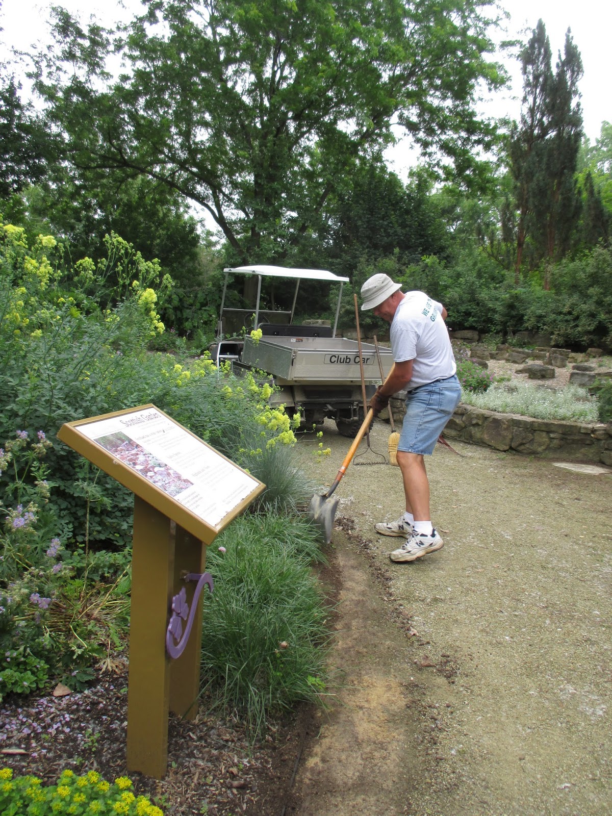 Above is Ron P. skimming older gravel to replace with fresh gravel. We do this annually along path edges to freshen up the paths. Ron was one of many volunteers that helped today (see photos below). Tasks included weeding, planting, watering, labeling, carpentry and much more. Thanks to Ron P., Ron R., Bob C., Alan M., Pat M., Bob K., Dave T., Vern, Jim, Maury, Dr. Gredler, Rollie, Chuck S., Jenny, Mary W, Roy W., Kathy, Eva, Peg, Vicky, Bonnie, Ron Y., Mary R., Kylie, Kyle, Suzie, Marilyn, Dick, Mary Ann, Ron W. Bev W. and the six volunteers I had from the Bower City Garden Club in the afternoon for planting. I'm sure I missed a couple people but thanks to all for sure! Ron W. and Bev W. are moving and we all wished them the best in their future endeavors. We haven't seen the last of them and their 9 years of volunteerism have been much appreciated.