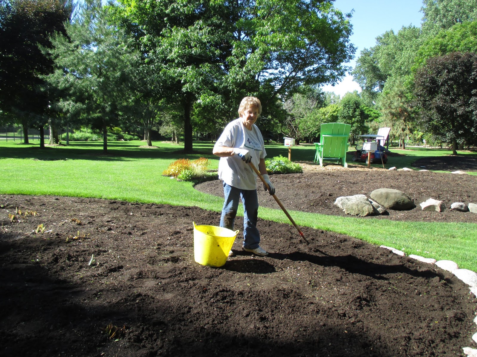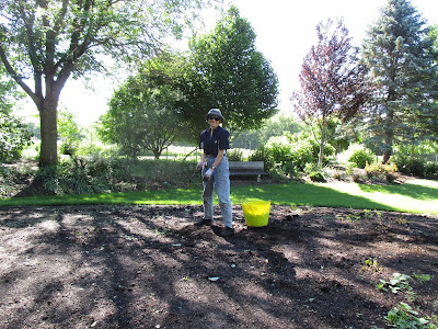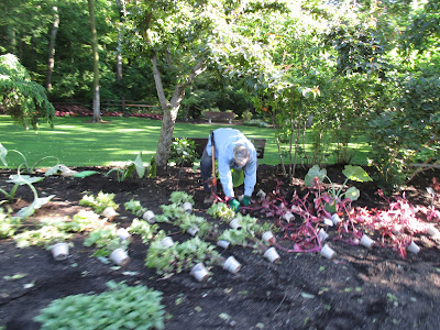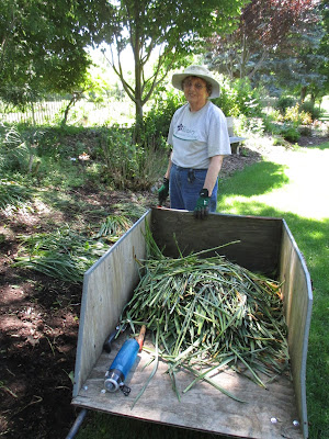 We had a nice turnout of volunteers with everyone enjoying the great weather. I placed plants immediately and Pat (above) started planting early this morning and was later joined by Barb (fourth photo down). Vicky (directly below) did a nice job tidying up two large areas that needed their bulb foliage removed and weeds addressed as well. She brought back many loads of debris. The second and third photos down show Kathy and Eva respectively as they did a great job hoeing out weeds from two areas that we started planting later in the afternoon with help from Shirley (ninth photo down). The ladies did a great job. Vern was in (fourth photo down) for some carpentry work and we saw Jim D., Dick H. and Ron R. stop by as well. Dr. Gredler and Bill O. were both in for mowing. The sixth photo down show Kay (left) and Barb posing nicely by a beautiful clump of Martagon lilies (Lilium martagon). The seventh photo down shows (left to right), Hal, Magda and Doris. All three did a great job helping plant today.. Dr. Yahr and his daughter Lynn can be seen in the eighth photo down. We also saw Maury (lots of errands), Mark S., Mary W., Elsa and many others today.