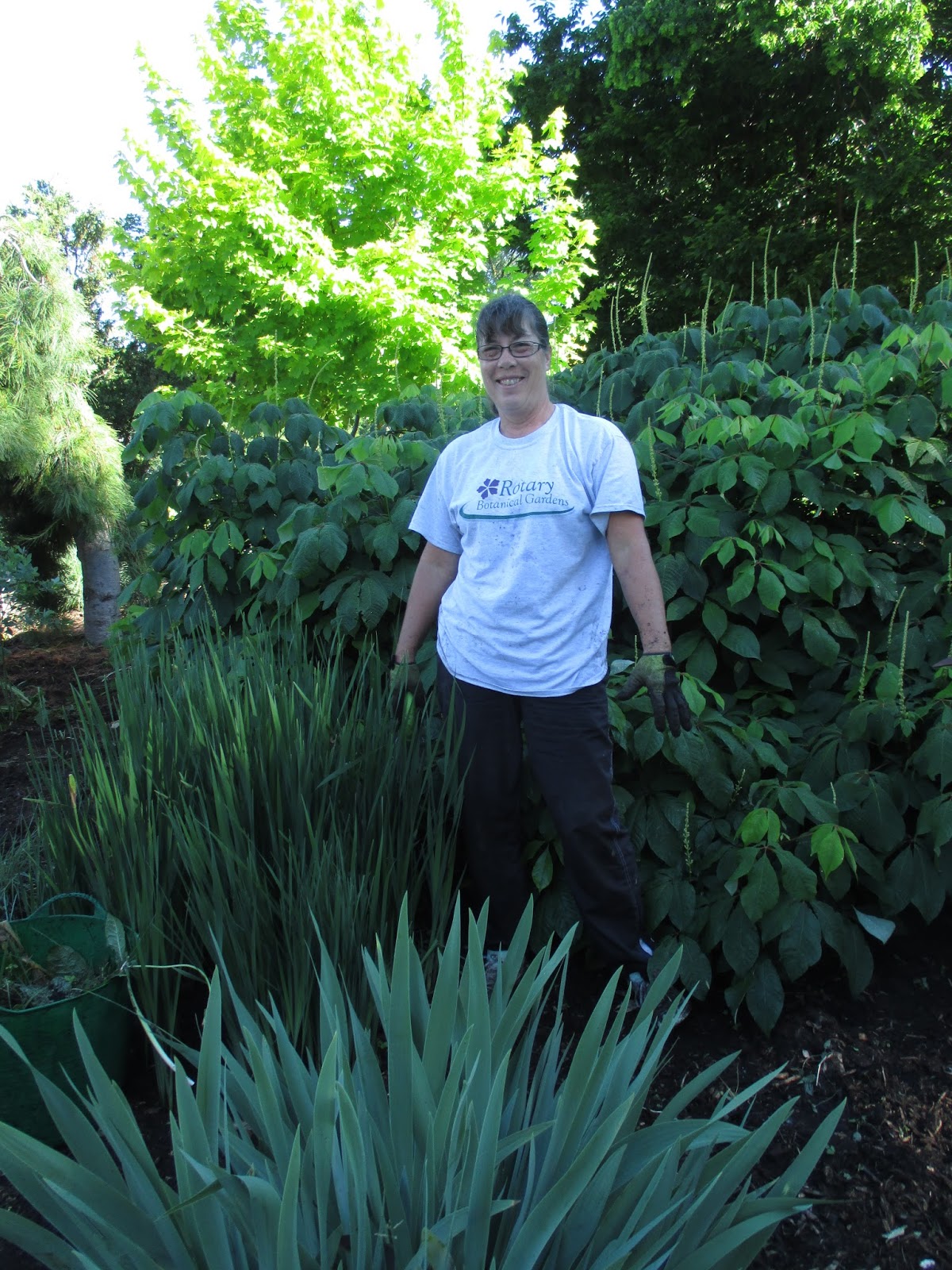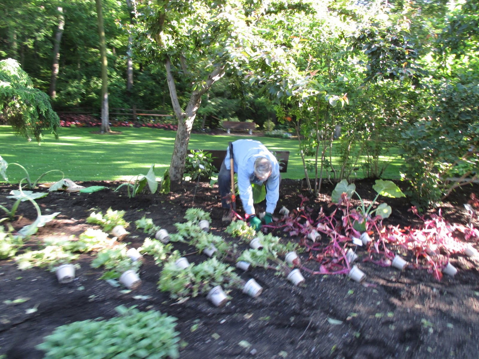 The grounds staff had a busy day. Nolan (day 2) was trained in mowing, watering and weedwhipping. He did a nice job mowing today and worked on cutting back daffodil foliage in the Potter Daylily Collection. Larry also had some mowing, water feature work and a wide range of other tasks. Big John edged, rototilled, prepared areas for seeding (conversion to turf) and had many other projects. Cindy hauled out the Elephant Ear Collection which was later planted by Barb. She also worked on some watering, weeding and general tidying in multiple areas. Cheryl focused her clean-up efforts near the zig-zag bridge and also did some planting. Janice worked on signage, gardening, the cutting display and other tasks. I was able to haul out plants most of the day which was time well spent! Below are more photos from today.