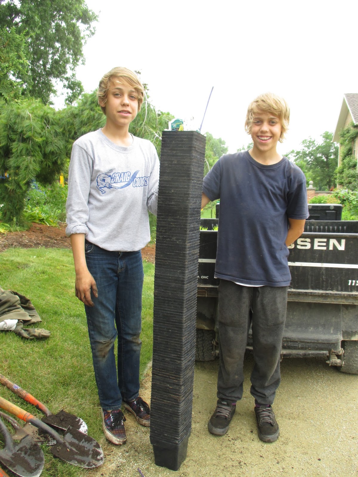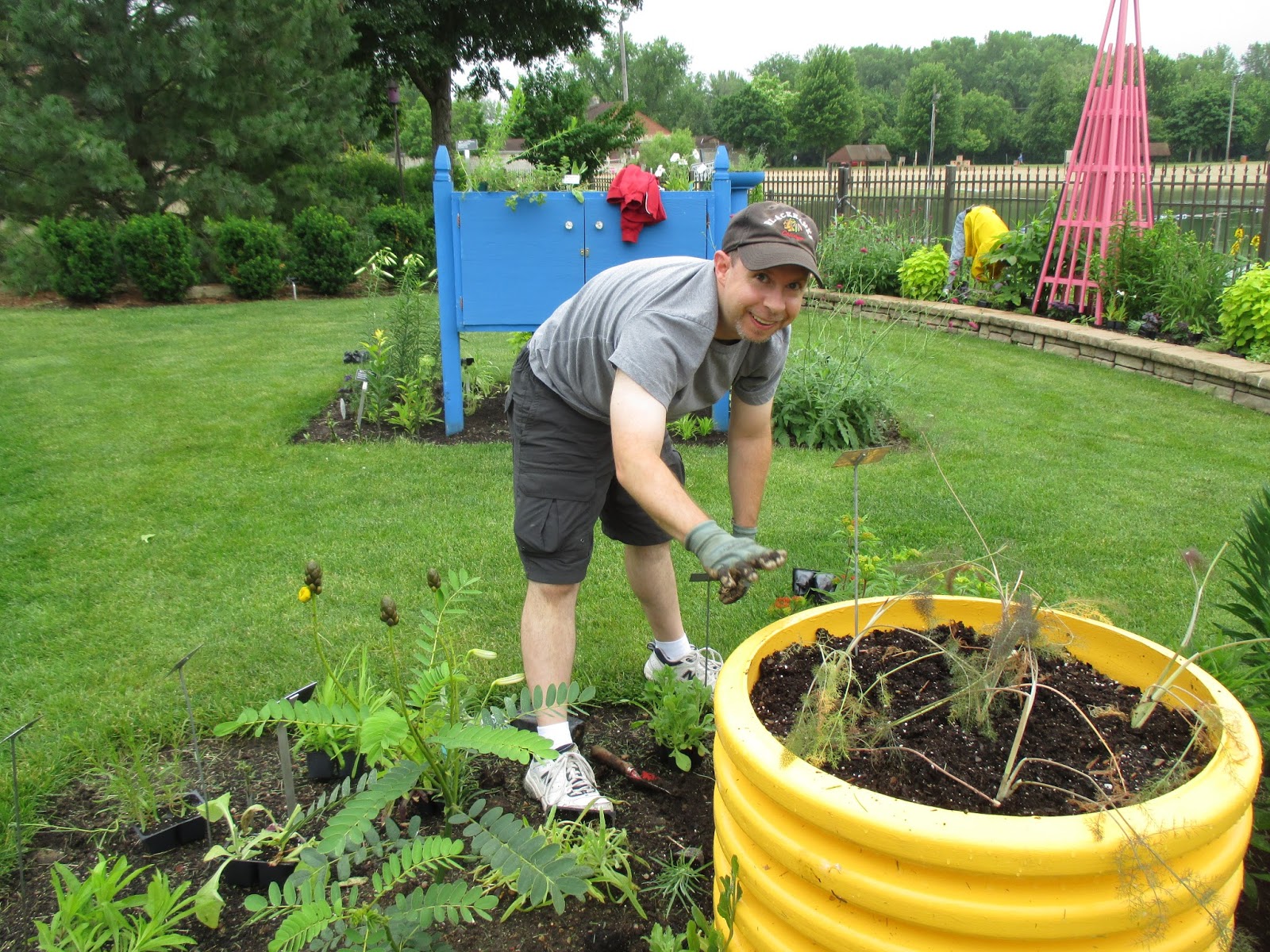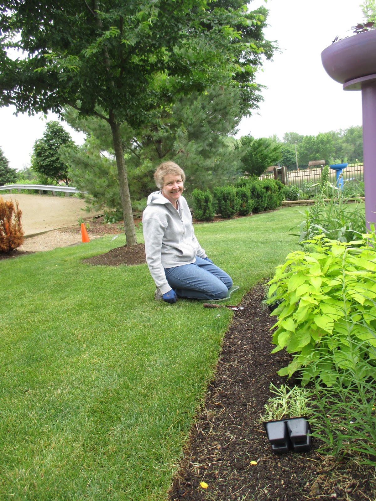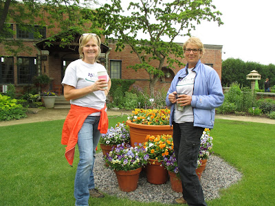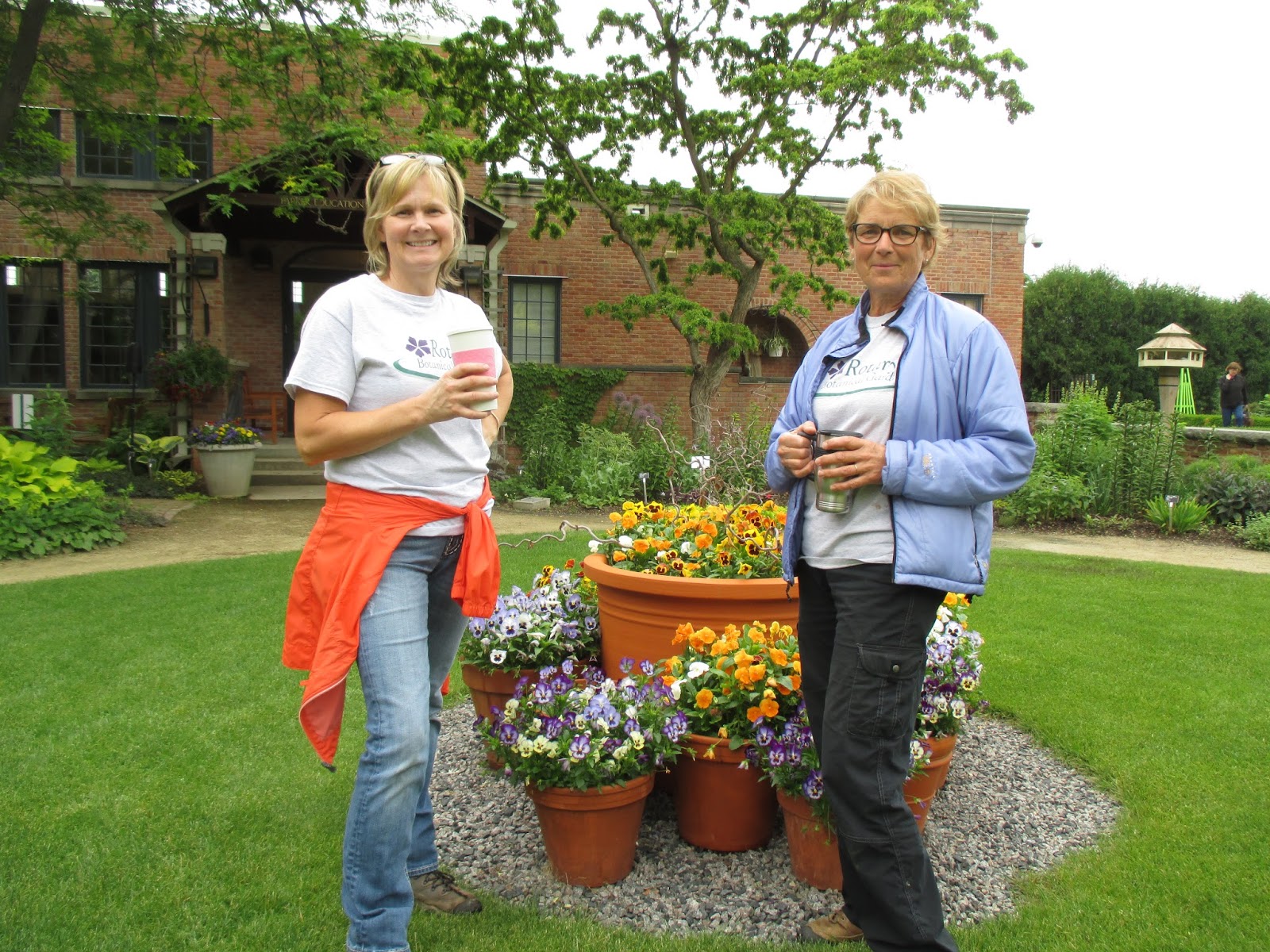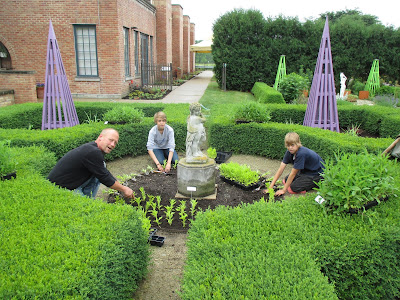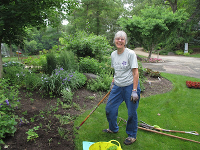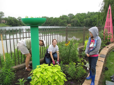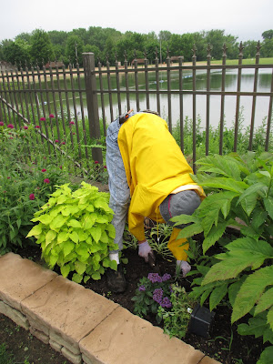 Despite some light drizzle this morning, we had a great volunteer crew come to our fifth of five Spring volunteer work days. With planting our goal, we ended up working through three areas; the Nancy Yahr Memorial Children's Garden, formal annual sections and Jungle Garden. Zach and Tyler (above) are showing off just some of the plants they installed this morning (look at that stack of pots!). Thanks to Zach, Tyler, John, Margaret, Aubrey, Sue, Lily, Shirley, Mike, Joe, Brian, Gena, Mary D., Gary and Eva for helping with the work day. Big John, Janice, Larry and Bill O. were all very helpful in coordinating our efforts which include watering in new plants and collecting all the plastic pots and debris after an area was completed. Magda (directly below) worked in her assigned garden as did Marcia and Mirjam (last photo down with Marcia to the left). Kelley and Sue were also in for planting in the shade garden and we saw Maury, Dr. Yahr, Darcie, Shelly B. and many others today as well. Great teamwork! Our next official volunteer work Saturday is October 17th where we will be planting bulbs! However, we'll still take daily help from anyone wanting to weed and/or plant!