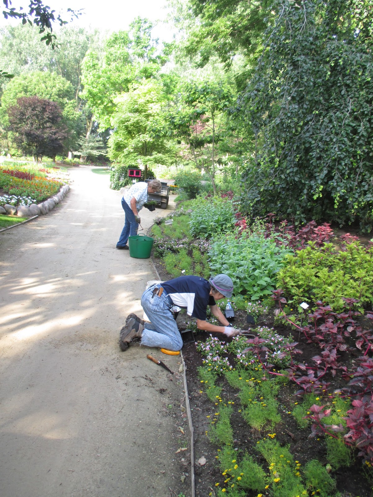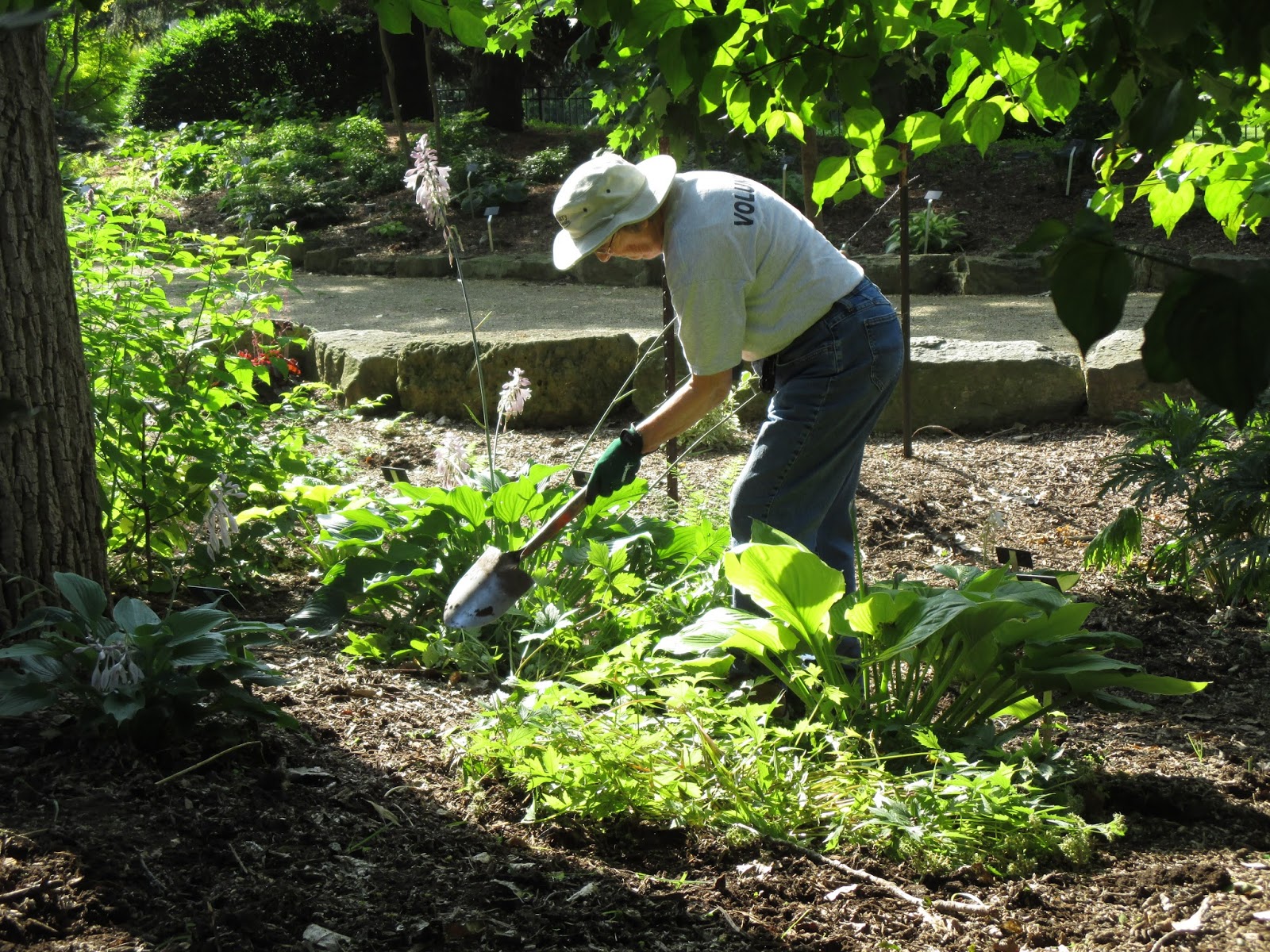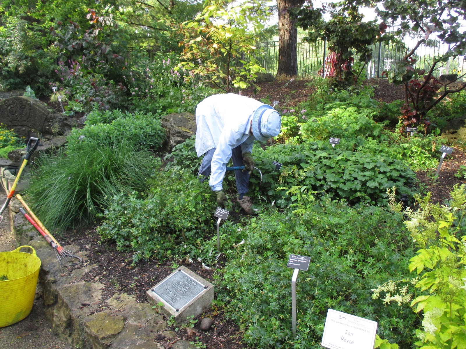 Volunteers were extremely helpful throughout the day. Marv (above) continues improving the moss island in the fern & moss garden with his excellent attention to detail. He is also encouraging significant moss establishment near the upper Japanese garden entrance. Directly below are Eva (foreground) and Kathy working on some weeding and planting in and around the gazebo garden. The second photo down shows Shirley in the woodland glen garden digging up some weeds. She has helped maintain that space for over 15 years. Jan (third photo down) worked her weeding kung fu in the Scottish garden which she has maintained for over 18 years! Lots of very committed volunteers here at the gardens. The fourth photo down shows Vern who worked on the "Nature Nooks" which are our 2015 Garden Art Project. Come see all 25 of these artistically decorated pieces that were designed after the Little Library concept. Bill O. was in to do his mowing as was Dr. Gredler. Bill also worked on one of our vehicles and Dr. Gredler reseeded some new lawn areas. Kay came in to check over her area and shifted to weeding some of the annual beds near the Alphabet Jungle Garden. We also saw Karen and Cheryl P. tidying in the Japanese garden and Sue and Kelley worked in their section of the shade garden. Pat C. worked on new labels and we also saw Jean S., Marcia N., Sue S., Gary S. and many others. It was a productive day out in the gardens!