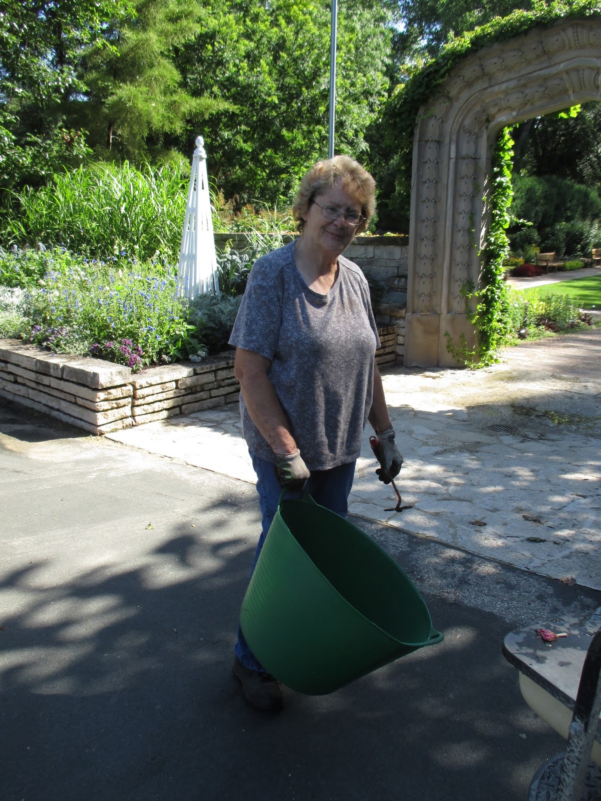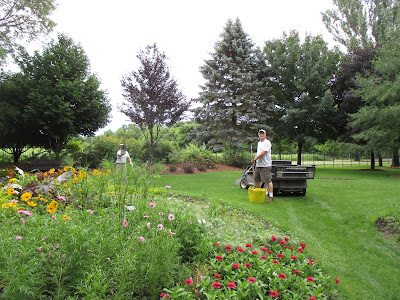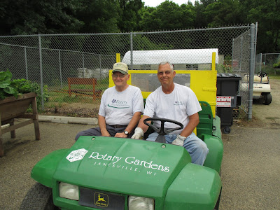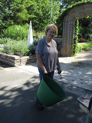Our volunteers had a super day out in the gardens and worked around the muddy areas as needed. Above are Lloyd (look to the left where Lloyd is skillfully balancing a spade) and Ron R. to the right. These guys also helped with some tent set-up later in the morning. Directly below are Dick H. and Dick P. (driving). The guys had a big digging project (see further below, third photo down) in the Nancy Yahr Memorial Children's Garden this morning. Tomorrow we'll have a concrete ring installed around the new sitting wall/fountain. Kathy (second photo down) did an excellent job weeding in the reception garden which is starting to get another decent layer of carpet weeds. Taylor was in for some sweeping and then planting in the gazebo garden. Ed was out skimming up paths and adding new gravel. Dr. Gredler did his mowing rounds this morning and Maury moved between multiple tasks. Marcia and Mirjam were working in the English cottage garden. Gary had labels to work on but also came out to help with the tent set-up. Ron Y., Vern, Jim and Bobby K. had myriad obelisks to work on inside. We also saw Art (giving a cart tour), Janet M., Lisa I. (daylily chat) and many others today. Our Horticulture Therapy Committee also met this afternoon to chat about our August 11th event, Gardening as Therapy. It was another excellent day with great contributions from so many helping hands.