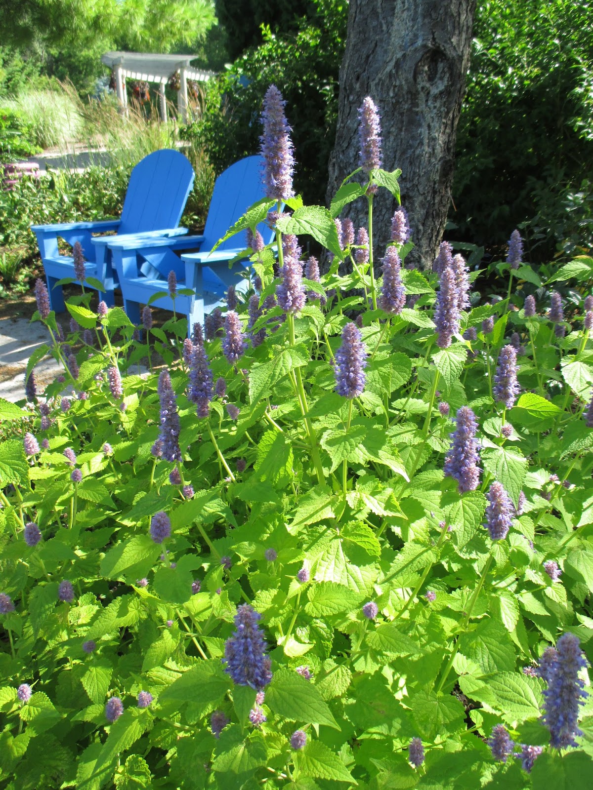 I'll admit that I was a bit worried that the rain predicted for both this past Saturday and Sunday didn't materialize. I envisioned a day full of irrigation, moving sprinklers and hand watering. Well, the sound of pounding rain and thunder early this morning allowed be to sleep well as we had a good 1" of rain come down and end just as our day started at 7 am. The day did get hot and muggy but this is the weather we've been waiting for to get our tropicals moving along like the 'Blue Angel' gentian sage (Salvia patens) seen directly above. The hummingbirds are going to like this one a lot.