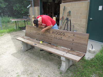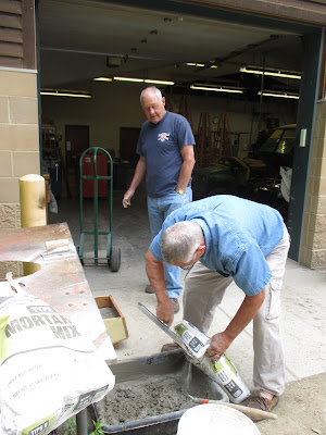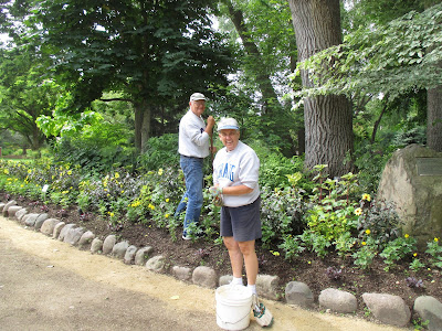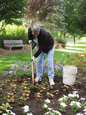 Our volunteers had a great day out in the gardens and what perfect weather to be outside! Directly below is Betty working in her berm with a strong focus on dealing with the "carpet weeds" in the gaps between the plants. Right now is the window to address these issues before the plants fill in and the weeds are near impossible to address. Nearby was Shirley C. (second photo down) doing the same weeding in her garden space. Vern (third photo down) was in to work on re-lettering this bench before setting it back out in the gardens. Kay came in for some weeding and did a great job in a large bed filled with annuals (and plenty of small weeds!). Don and Pearl (fourth photo down) tidied up their area and Stan, Karen and Cheryl P. all worked in the Japanese garden with pruning, shearing and tidying duties. The fifth photo down shows Maury (left) and Dick P. pouring concrete to mount a new plaque. Eva and Kathy continued their weeding project along the front slope area which is certainly one of our priorities! Janice came in and worked with the Chestnut House volunteers who did a great job planting . We also saw Bev F., Mark S., Gary, Ed, Dick H. and many others today.