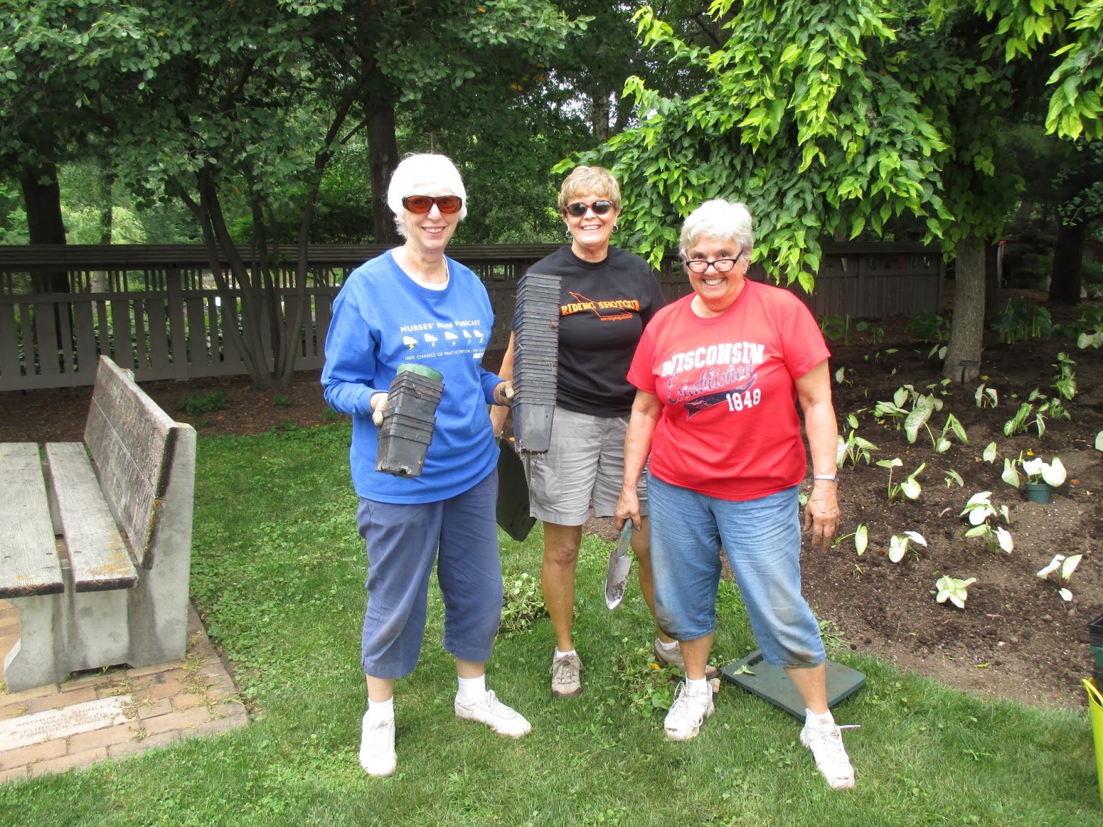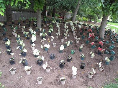 800 caladiums ready to go and ultimately planted by the Chestnut House volunteers and Myrt, Nancy and Patty seen directly below....