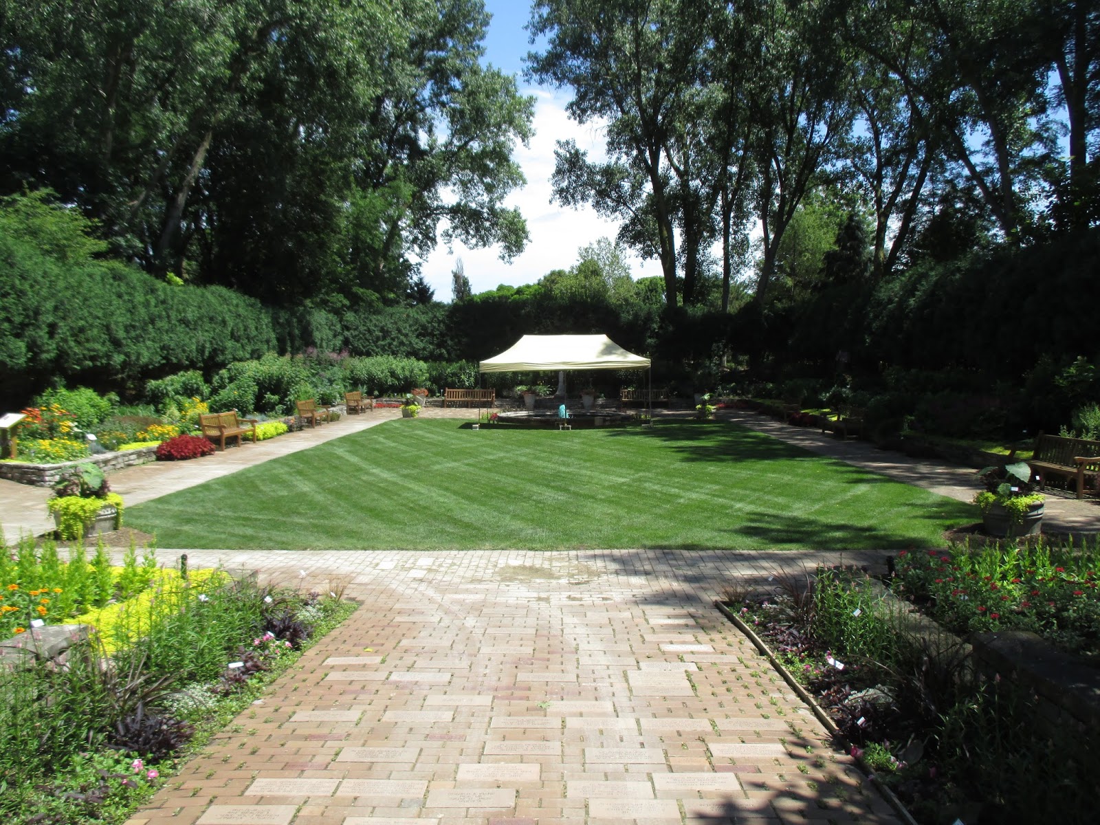 After another deluge last night of 6/10th of an inch of rain, the gardens are sufficiently wet everywhere I would say! We were commenting today that this July has seen the least amount of irrigation and sprinklers and we're pleased to focus on other tasks aside from watering! The photo above shows a tent in the sunken garden which will be the setting for our Rhythm and Blooms event Wednesday night (5 pm - 8 pm, $10) featuring the Arbor Ensemble Orchestra. Come enjoy this event and there will be both food and beverage sales as well. We're tidying up the sunken garden for an enjoyable evening. After a good rain, a day like this is prime for serious gardening and both staff and volunteers dove right in to a wide range of tasks.