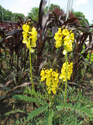 popcorn cassia (Cassia didymobotrya) with 'Purple Majesty' millet (Pennisetum glaucum) in the back - both are seasonals