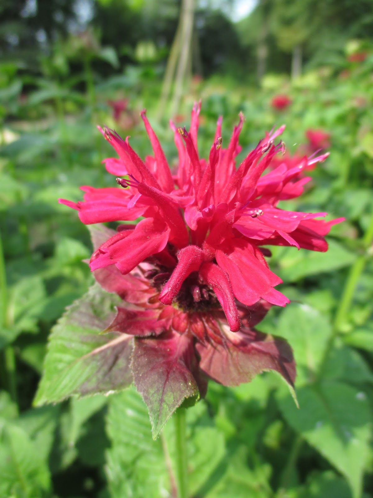 Nice shot directly above of bee balm (Monarda didyma) in the Thomas Jefferson Collection which is really filling out nicely. Our volunteers were a huge help today. Bill O. came in for his mowing duties. Kathy and Eva tidied in front of the Parker Education Center. Mary D. weeded in the sunken garden and was later helped by Kay who also worked on planting, watering and tidying her portion of the shade garden. Cheryl P. did more weeding in the Japanese garden while Jumbo Jim and two RECAPPERS continued clean-up efforts in that garden as well. Marv B. tidied up his two moss areas which look excellent. Jan R. worked her weeding kung fu in the Scottish garden and we also saw Maury, Hal R., Polly and many others as well.