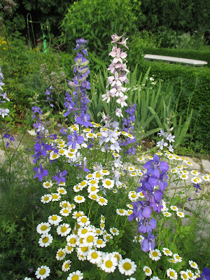 feverfew (Tanacetum parthenium) with larkspur (Consolida sp.) in the herb garden