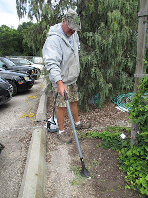 The grounds staff had a busy day. Big John (above) is testing out a "weed steamer" and we're experimenting on purslane (Portulaca oleracea) to see if it will kill it down through the roots. John said this was no problem as he's done all the vacuuming at home for the past 20 years... John also ran irrigation, set up sprinklers, watered, weed whipped, loaded debris, etc. Bob K. worked on general watering, watering containers and his gravel project. Larry H. also watered then moved on to push mowing and composting. Cindy tidied multiple areas and moved on to watering containers and some other projects. Aside from placing plants for installation by Kay, I'm focused on the looming Fall Plant Sale and am in "pre-strategy mode" for the Holiday Lights Show.