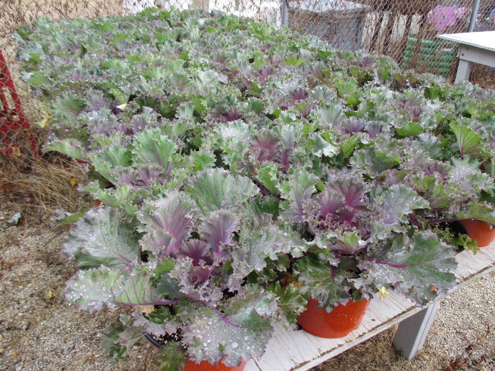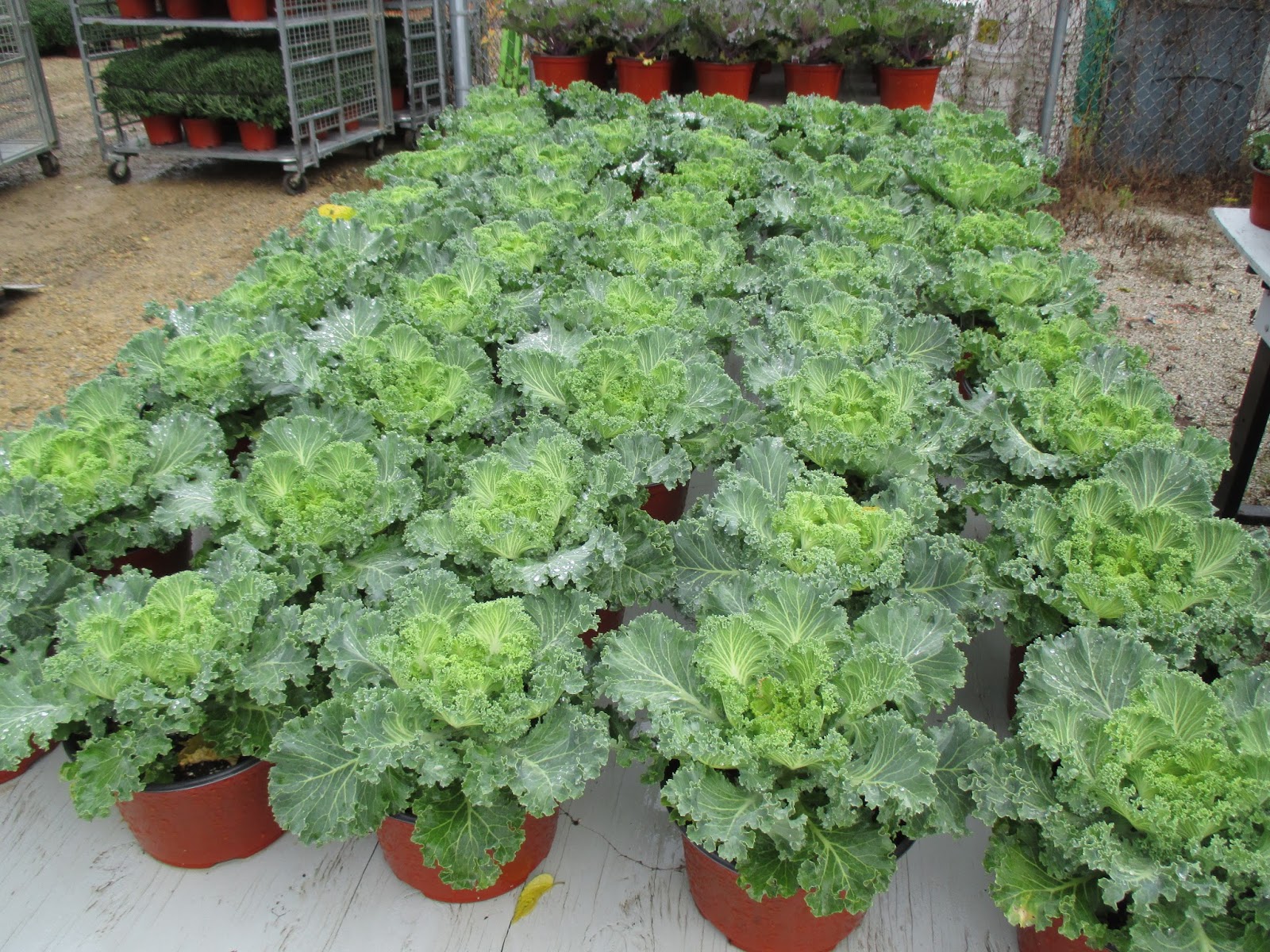 The kale (Brassica oleracea) seen both above and below will be part of the Fall Plant Sale as well ($5 each!). The bottom photos shows some of the mum unloading during the first of two deliveries. These gigantic mums are only $8 each this year. We also had two trucks (one huge one) with perennials and two van loads of asters! More will be arriving tomorrow and we'll begin all the sorting and tagging as well. The grounds staff had a very busy day. Everyone was on hand (Big John, Terry, Bobby K., Larry H., Cindy, Cheryl and Janice) and everyone bounced between indoor and outdoor duties depending on the weather. Everyone was also involved with some degree of unloading as it was a busy day for these plant sale deliveries. Some gardening was accomplished but much of our work was over at the Horticulture Center. Gardening and event preparations will also be the order of business tomorrow too!