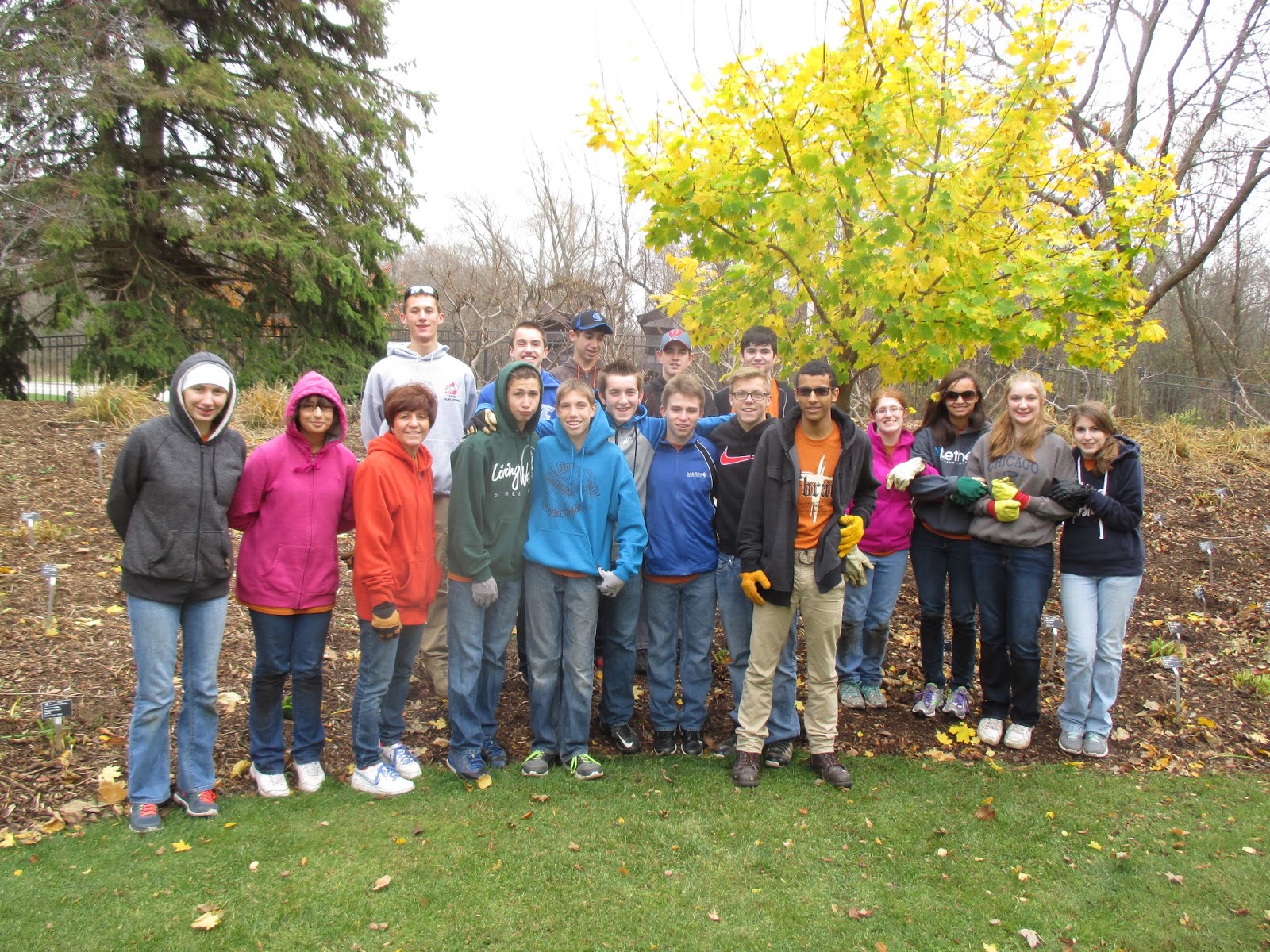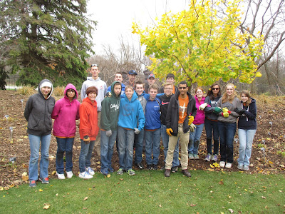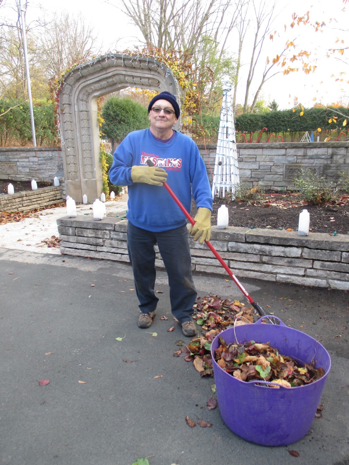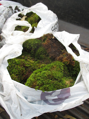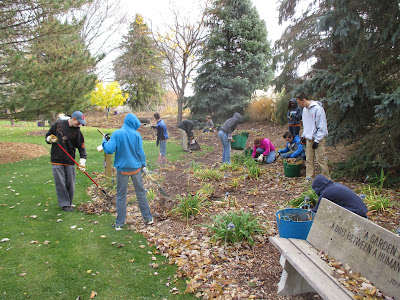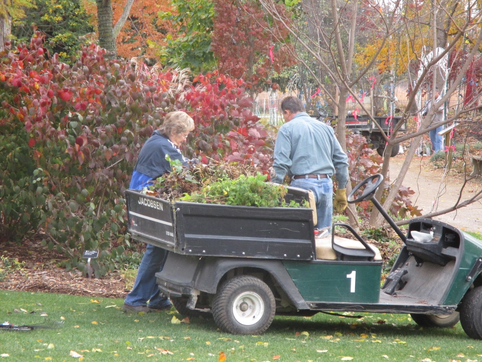 There is no shortage of fall clean-up out in the gardens although we're making it challenging for our volunteers like Alan (above) who have to work around our cords and other elements of the HLS! Below are Kathy and Dave, who along with Eva, tidied up three different areas. Marv (second photo down) was in to work on both moss areas that he maintains and he had a gift from "Mr. Moss" (Dale S.) of four bags of collected moss sitting outside the Horticulture Center this morning. Marv utilized all of this mossy donation (third photo down) in short order! Kay (fourth photo down) continues to do an excellent job tidying up the Scottish garden and brought back many loads of debris which also included plenty of late weeds she removed as well. Dr. Gredler was in for some mowing and Dick H. got our three snowblowers ready for action. The fifth and sixth photos down show students (with their teacher Kath) from Oakhill Christian High School helping with tidying in the Potter Daylily Collection (which they mulched this past spring incidentally!) this morning. Janice organized this group and they also shifted to the Japanese garden for leaf collection as well. They are an energetic bunch and I believe Kath has brought them down every spring and fall for the past 10 years easily. Janice also worked with the Chestnut House volunteers today at the Horticulture Center on a wide range of gardening tasks. We also saw Gary, Rollie and many others today.