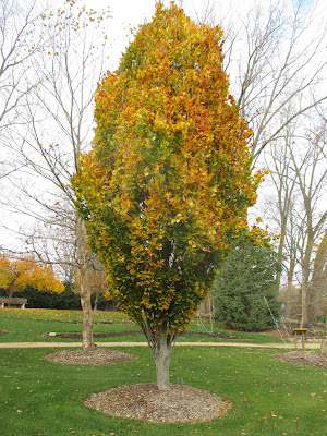 The grounds staff took advantage of another decent day although it did get quite windy and chilly in the afternoon. Cindy spent time refining the half gallon milk jug luminaries around the route of the HLS. The entire route is lined with these luminaries which will guide our visitors through the entire show. Janice worked with our two big volunteer groups today and helped Kris K. with some preparations for the symposium tomorrow. Big John and Terry had no shortage of HLS set-up duties after they helped clean-up some of the wind damage and downed lights this morning. The guys keep steadily taking out and placing our displays and their progress has been significant over the past six weeks. Aside from some meetings, I was able to run extension cords for another six hours today and will need as much time as possible next week to finish up. We're almost out of cords due to the expansion of the HLS route so we will bulk up on supplies next week. As seen below, there is no shortage of November color out in the gardens.