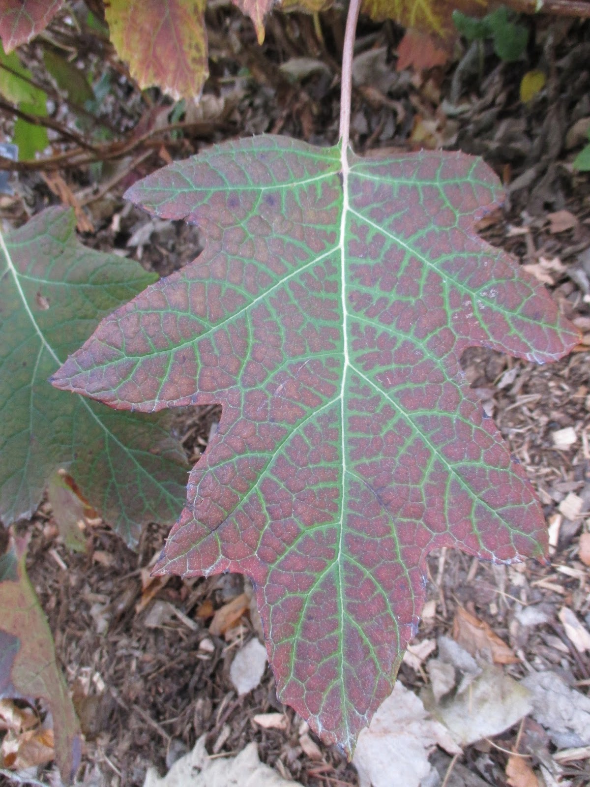 fall color intensifies above on a leaf of oakleaf hydrangea (Hydrangea quercifolia) - woody shrub