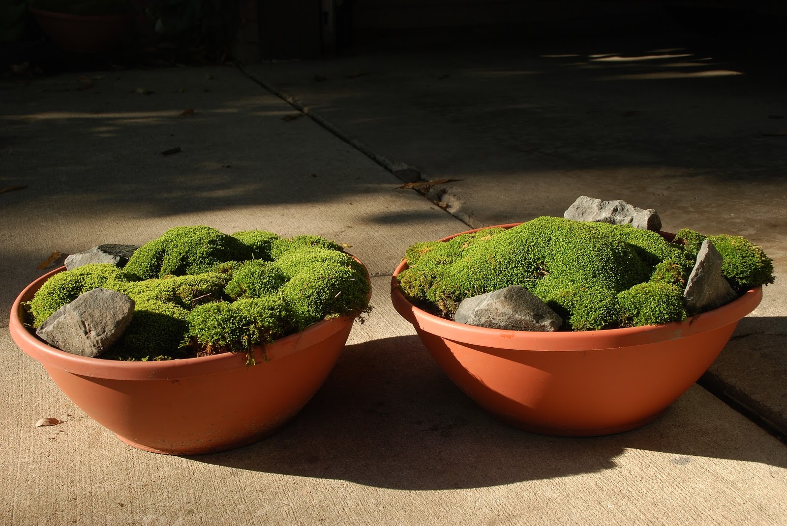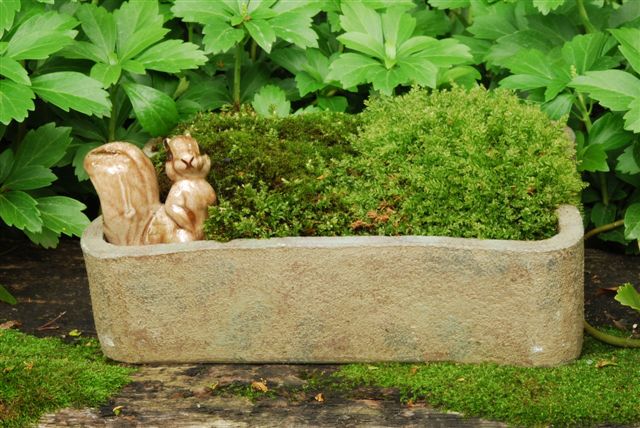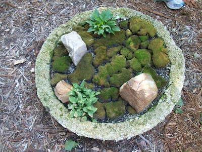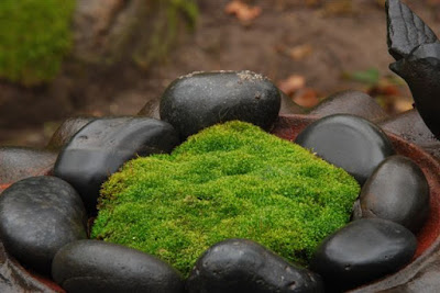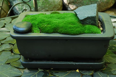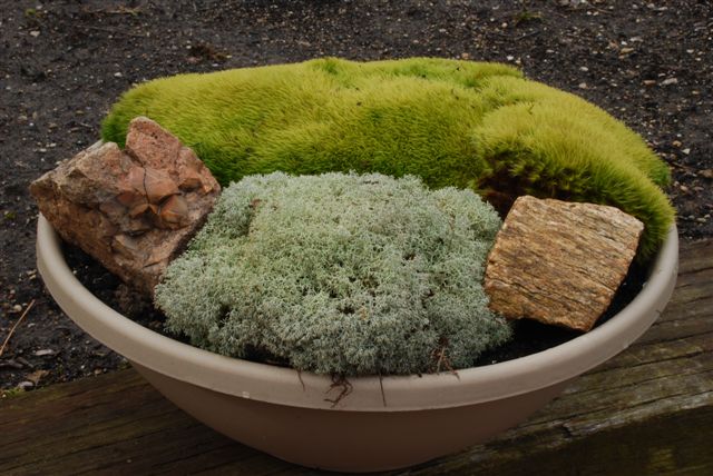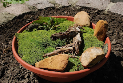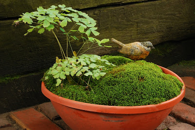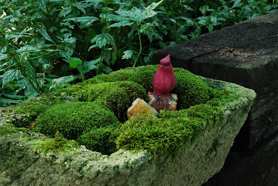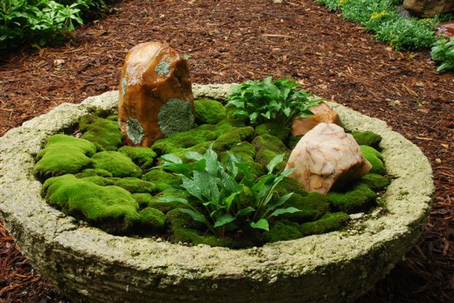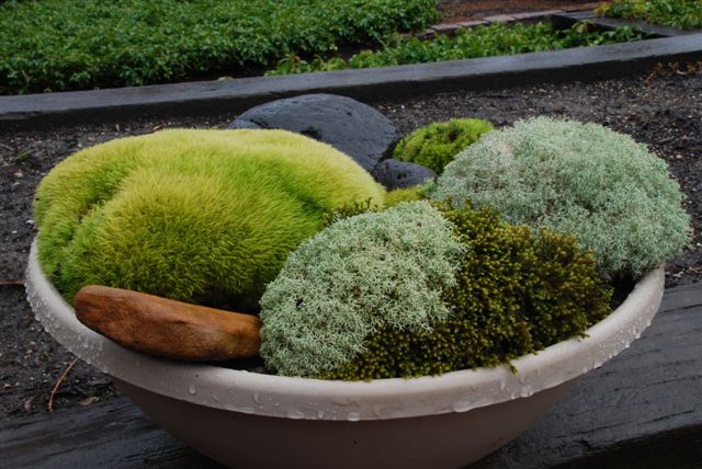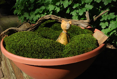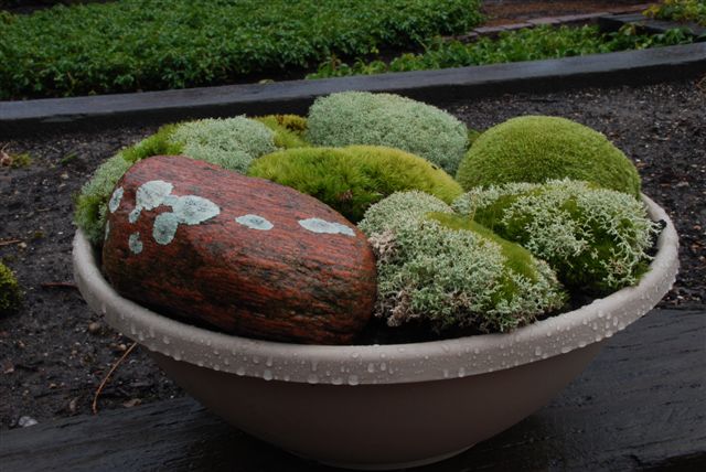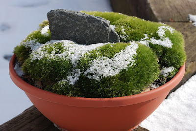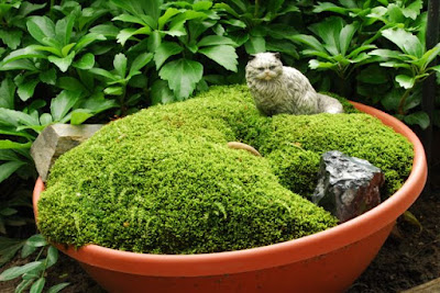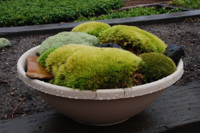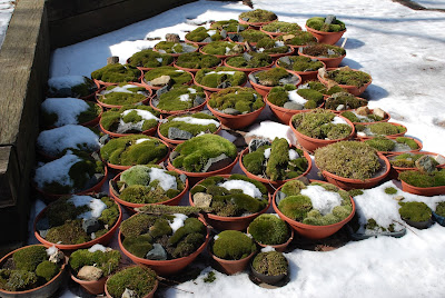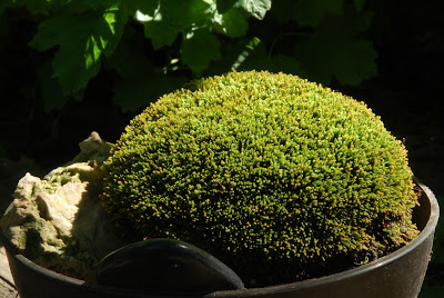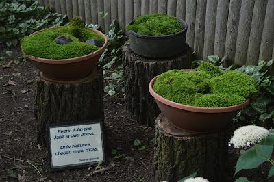 I think my only image in this blog is the one directly below of "Mr. Moss" (Dale Sievert). Dale has been involved with our moss garden at RBG for many years and redesigned the "moss island" about five years ago. Dale, a retired economics professor from Waukesha, WI, is a noted authority on mosses and using them in the garden. I've visited his 1 acre garden in Waukesha twice and it is beautiful! A good portion of the shadier spots in his garden include large plantings of mosses. He also includes mosses in containers as well. These photos are from Dale and I believe he currently has over 300 containers of moss. Dale was just featured in the most recent issue of The American Gardener, which is the publication for the American Horticultural Society (AHS). Dale, and his prominent work with mosses, were featured in the Members Profile section and he continues to be recruited as a popular speaker on this topic. Dale continues to be our "moss consultant" and his passion for the use of moss in the garden is contagious. Note the heavy use of plastic pots for his mosses. Moss is certainly tough enough to withstand the winter, even in an elevated container. Keep in mind mosses don't actually "root" in to the soil and utilize water and nutrients through cell walls. Once established, mossy containers can offer significant impact and based on Dale's success seen here, it looks like we can all try a similar approach!